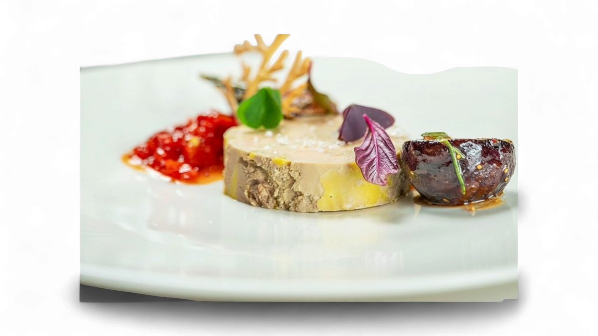 Pate de foie gras, dulceață de ardei iute, smochine caramelizate
