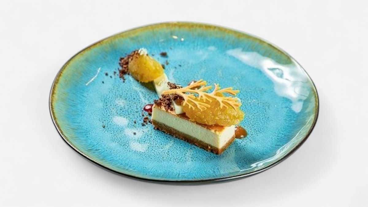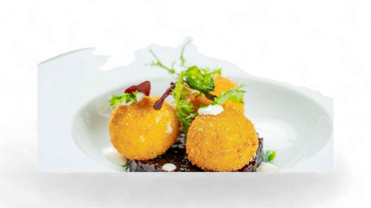 Crochetă de brânză de capră pe pat de tartar de sfeclă roșie și sos de hrean