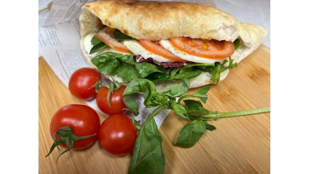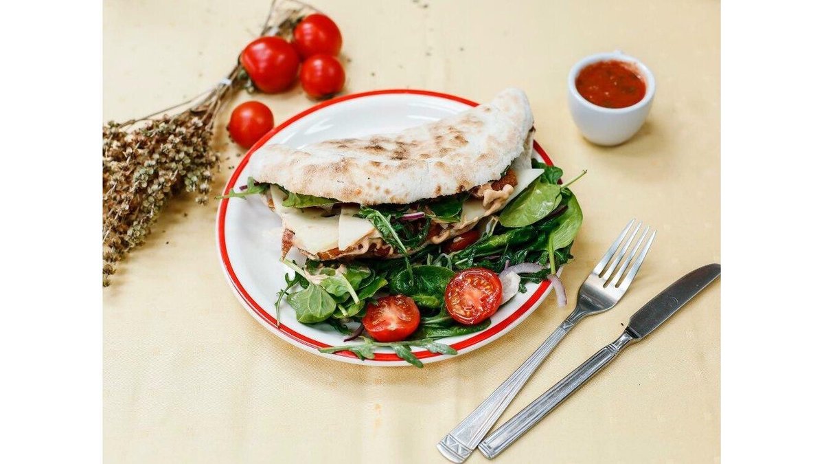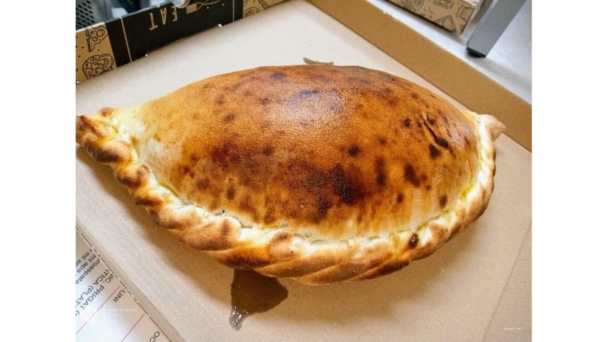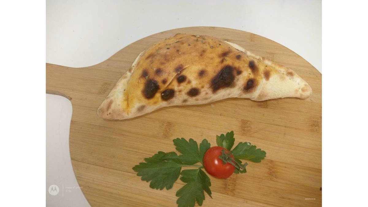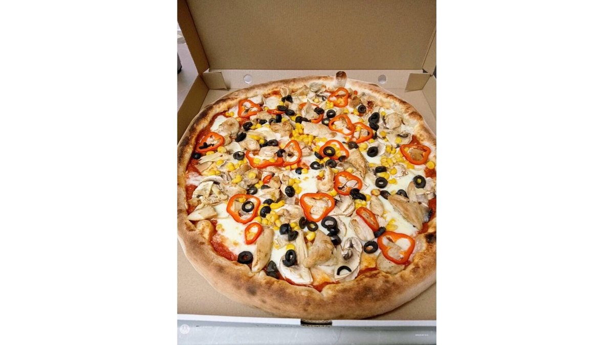 ALUAT DE PIZZA 200 G COPT IN CUPTORUL CU LEMNE , umplut cu schnitzel din piept de pui in panko si fulgi de porumb, sos de maioneza cu usturoi, sos de rosii ,salata de varza, castraveti murati, ceapa, rosii si cartofi prajitiI.