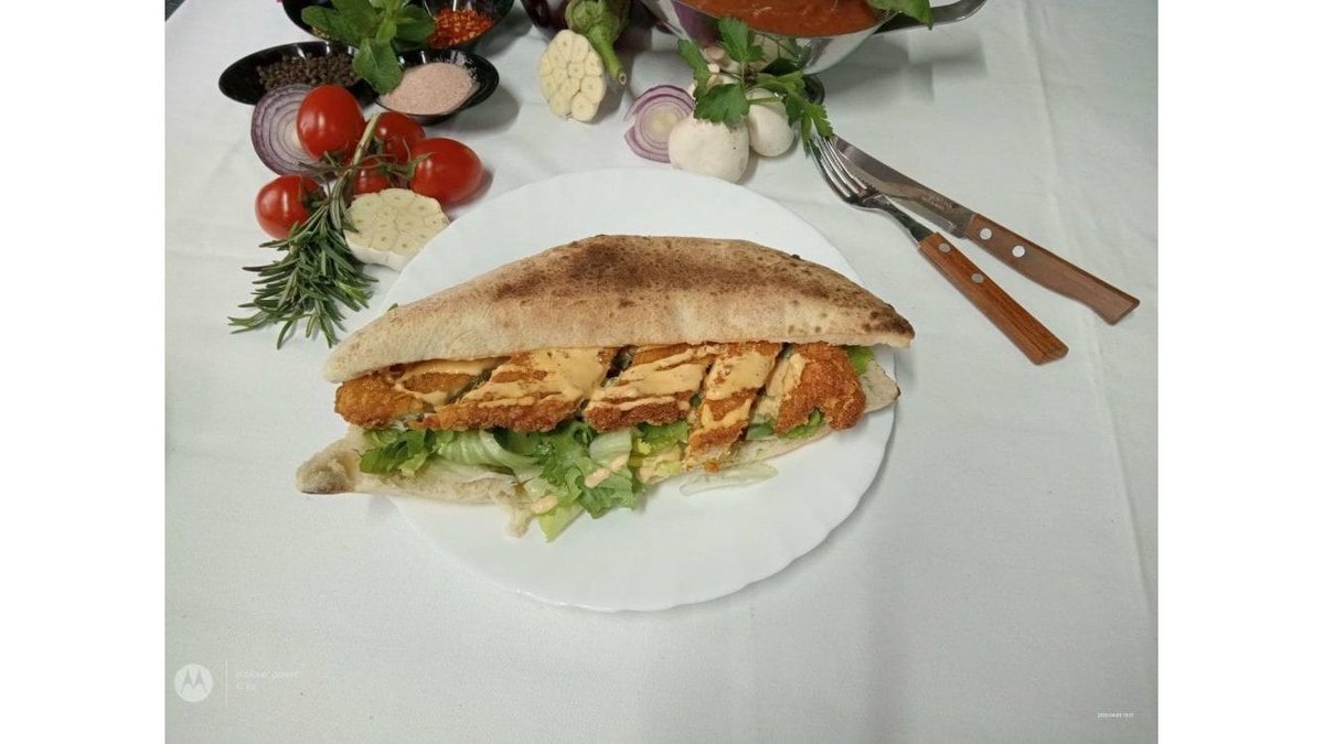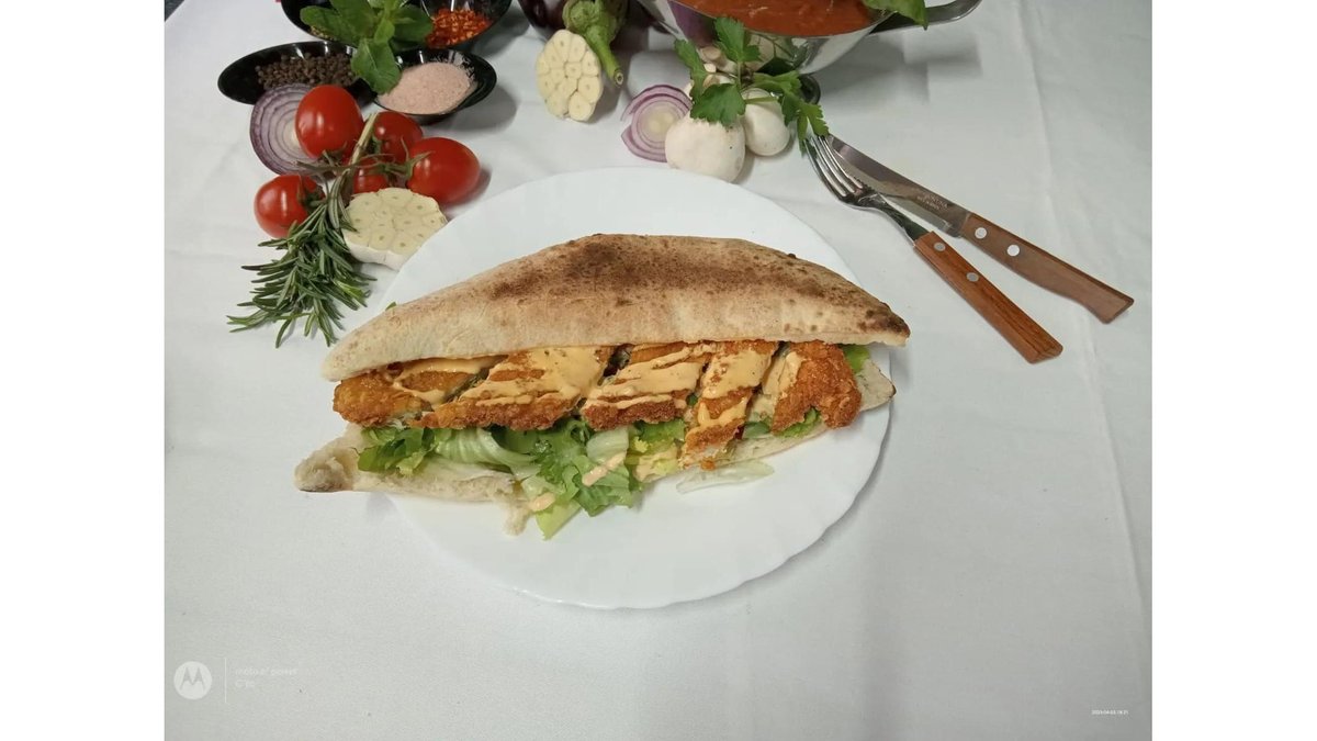 crispy de pui 150g, sos de maioneza picanta,cartofi prajiti ,castraveciori acri si rosie ,toate intr o painica de casa proapat scoasa din cuptorul cu lemne