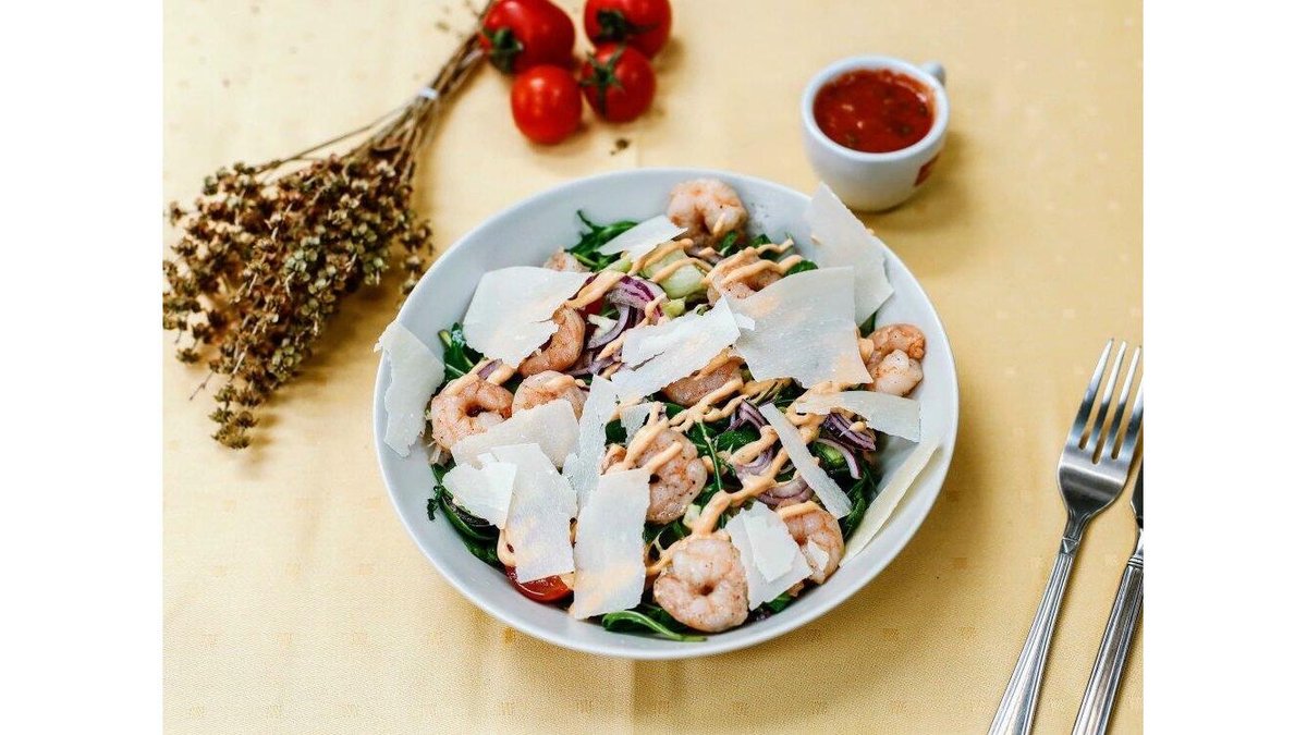 Salată verde, roșii cherry ulei de măsline extravirgin,suc de lamiae,maioneză cu usturoi,parmezan, și creveți 80-100 g/150 g
