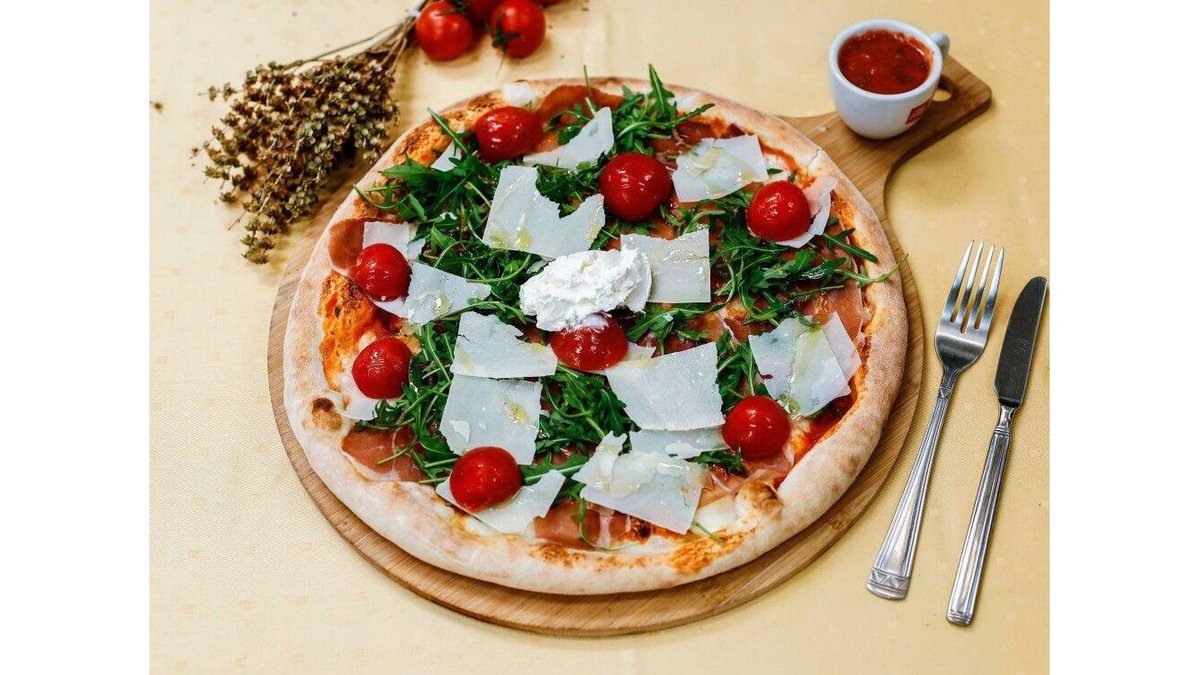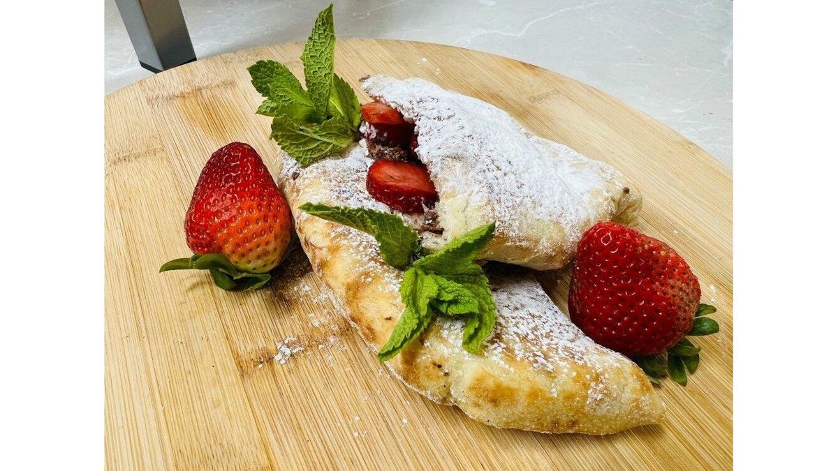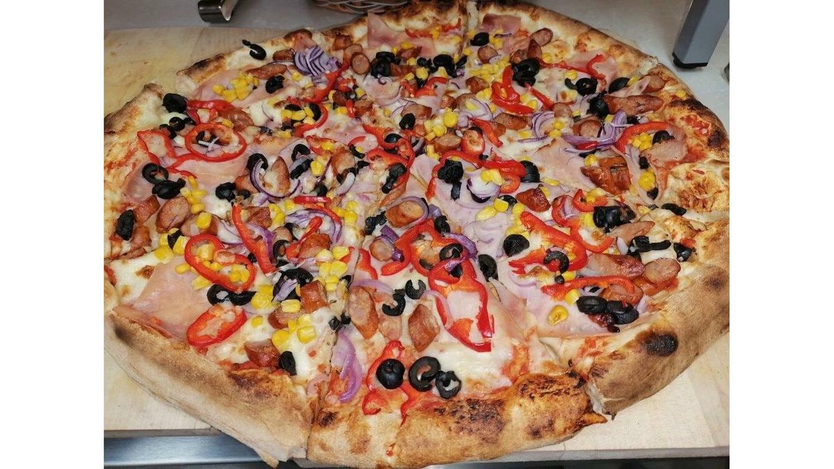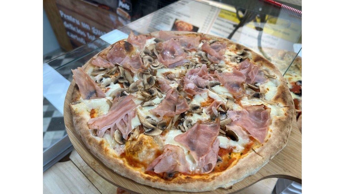 1 PIZZA PROSCIUTTO FUNGHI 40 CM DIAMETRUL COAPTA IN CUPTOR CU LEMNE SI 1 CLATITA UMPLUTA CU NUTELLA SI BANANE