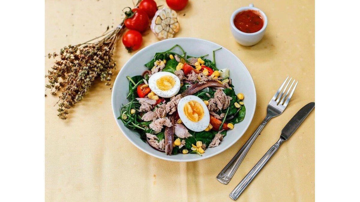 salată verde ton în suc propriu, măsline negre fără sâmburi ceapă roșie, hamsi în ulei ulei de măsline extravirgin ,ou, castravete și porumb. 300 g