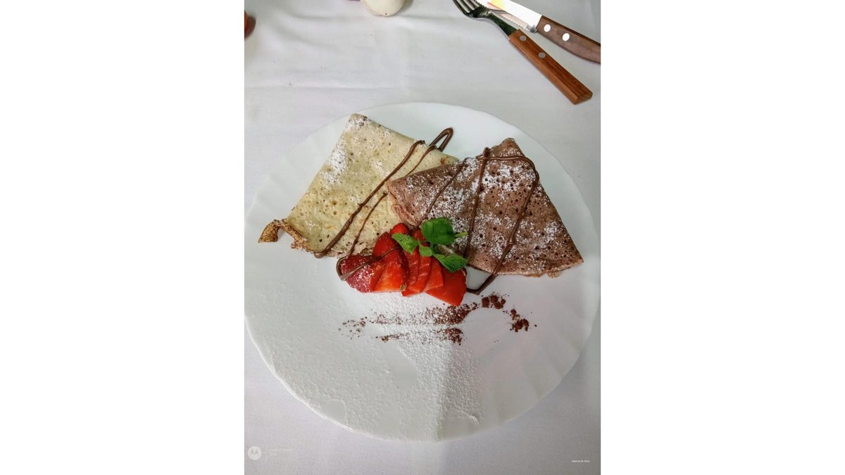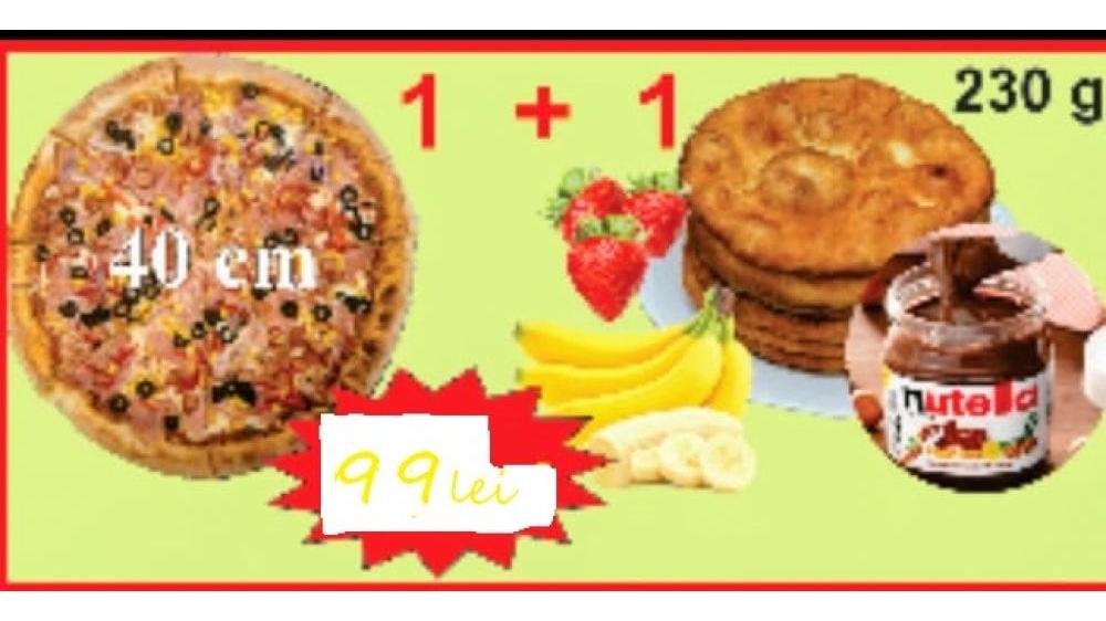1 pizza capriciosa 32 cm (sos de rosii,mozzarella,sunca,ardei gras,ciuperci,masline) si un sweet box( 3 clatite cu ciocolata,gem de prune cu nuca si branza dulce stafide)+ o portie de fructe proaspte