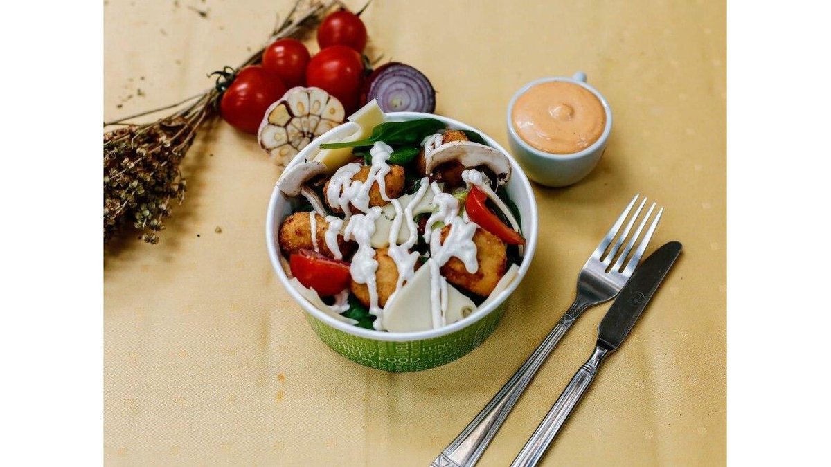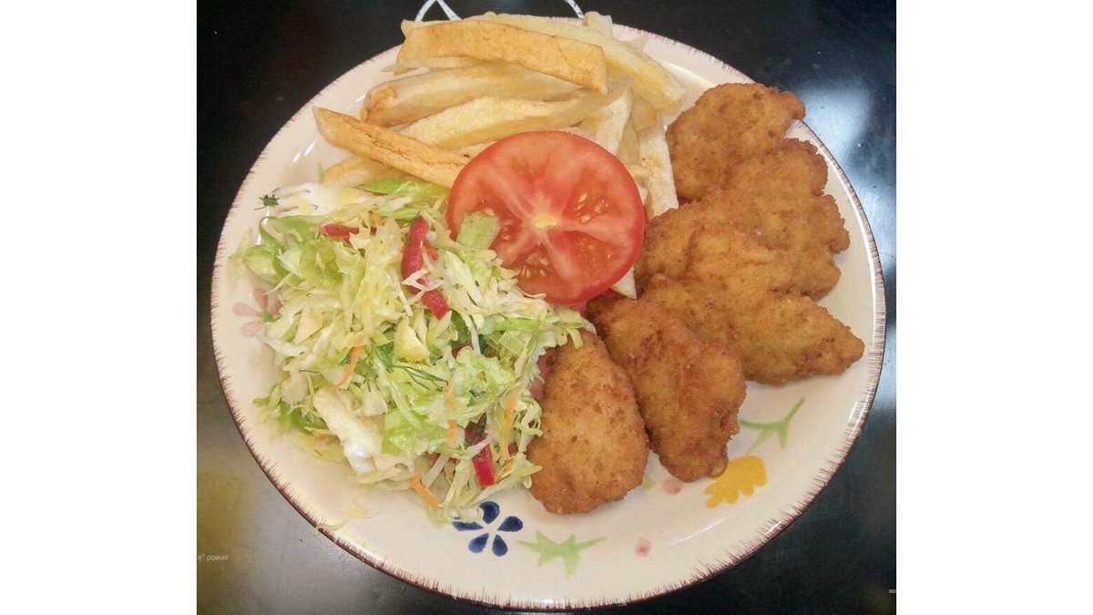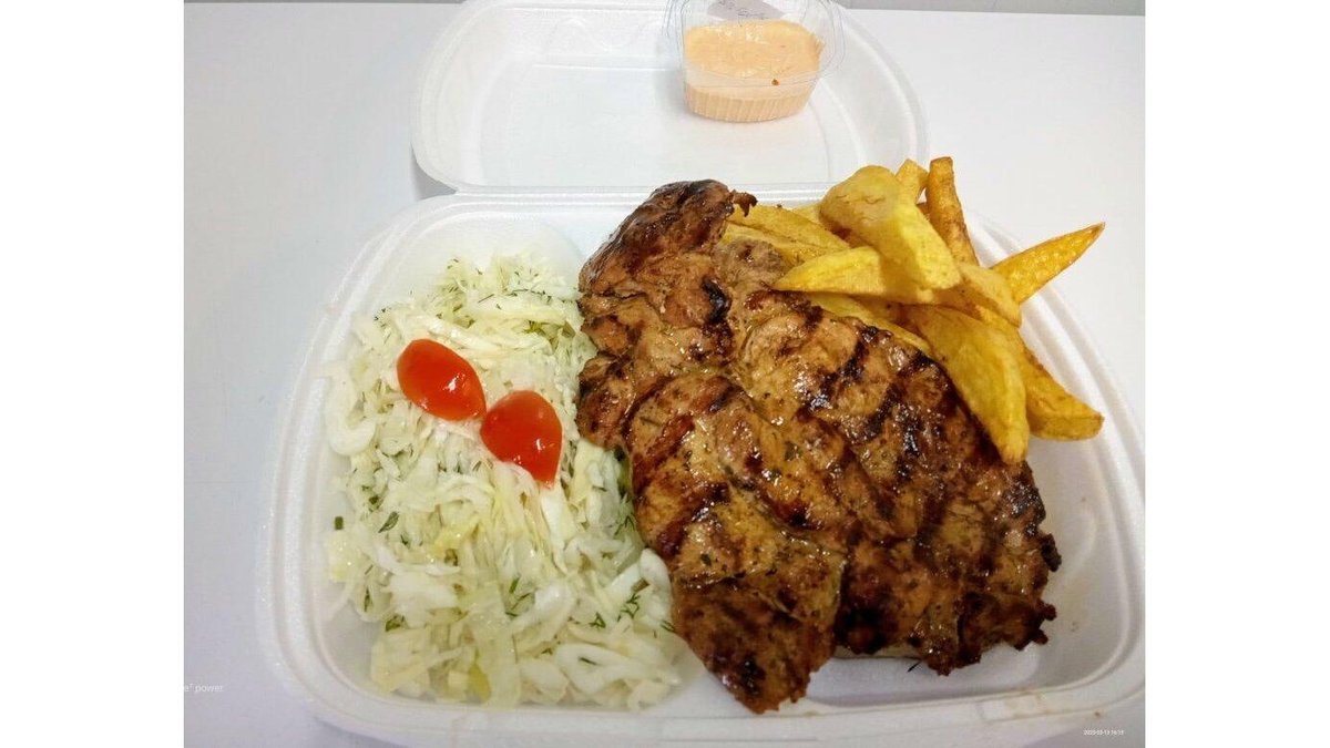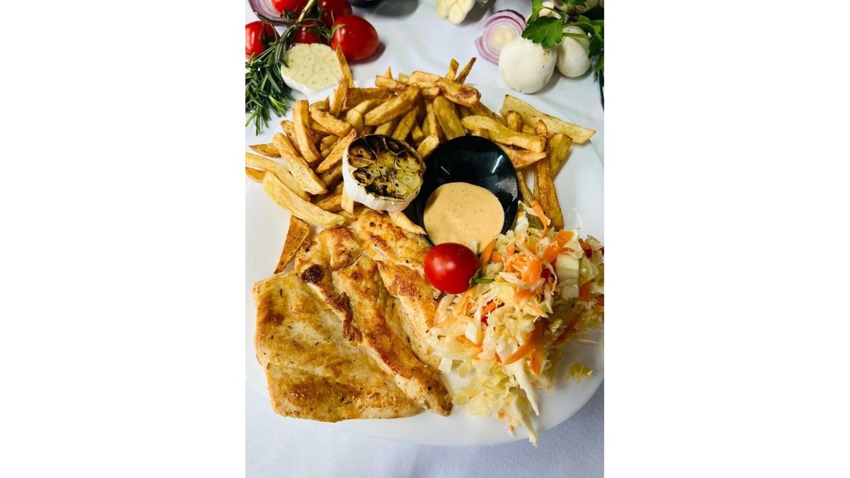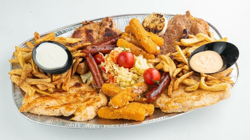 200g ceafa de porc ,200 g piept de pui,carnaciori 100g ,croquete din mozzarella pane 100g,cartofi prajiti 200g ,salata de varza alba 100g si 1 sos de maioneza dulce picanta