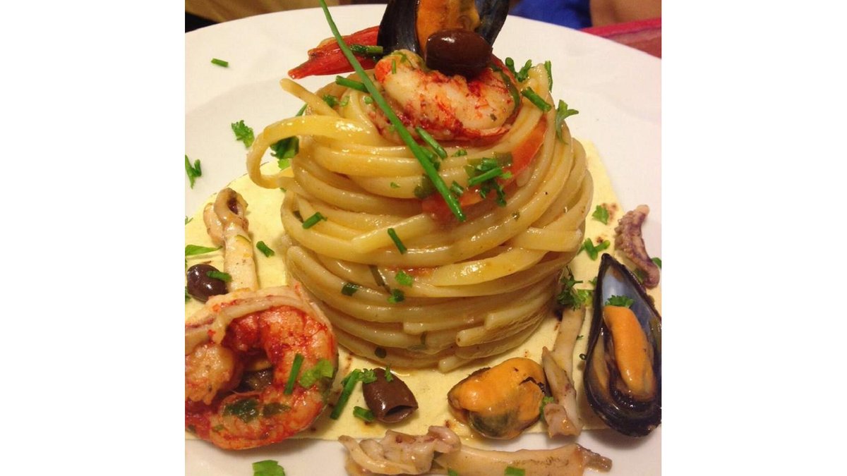 spaghete proaspete de casa, sos din pulpa de rosii. usturoi, creveti,calamar,tentacule, midii.