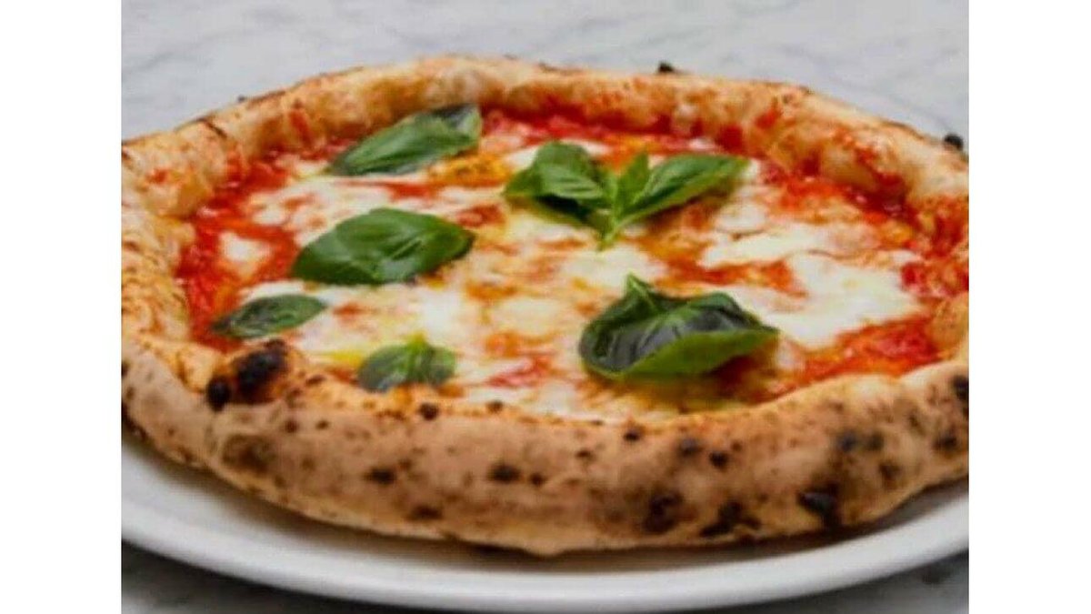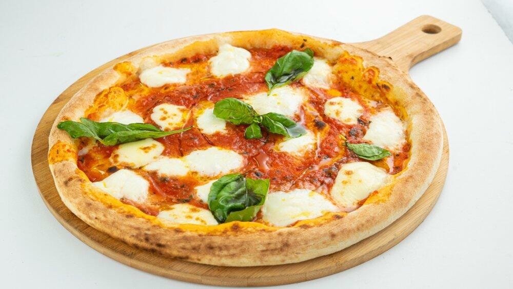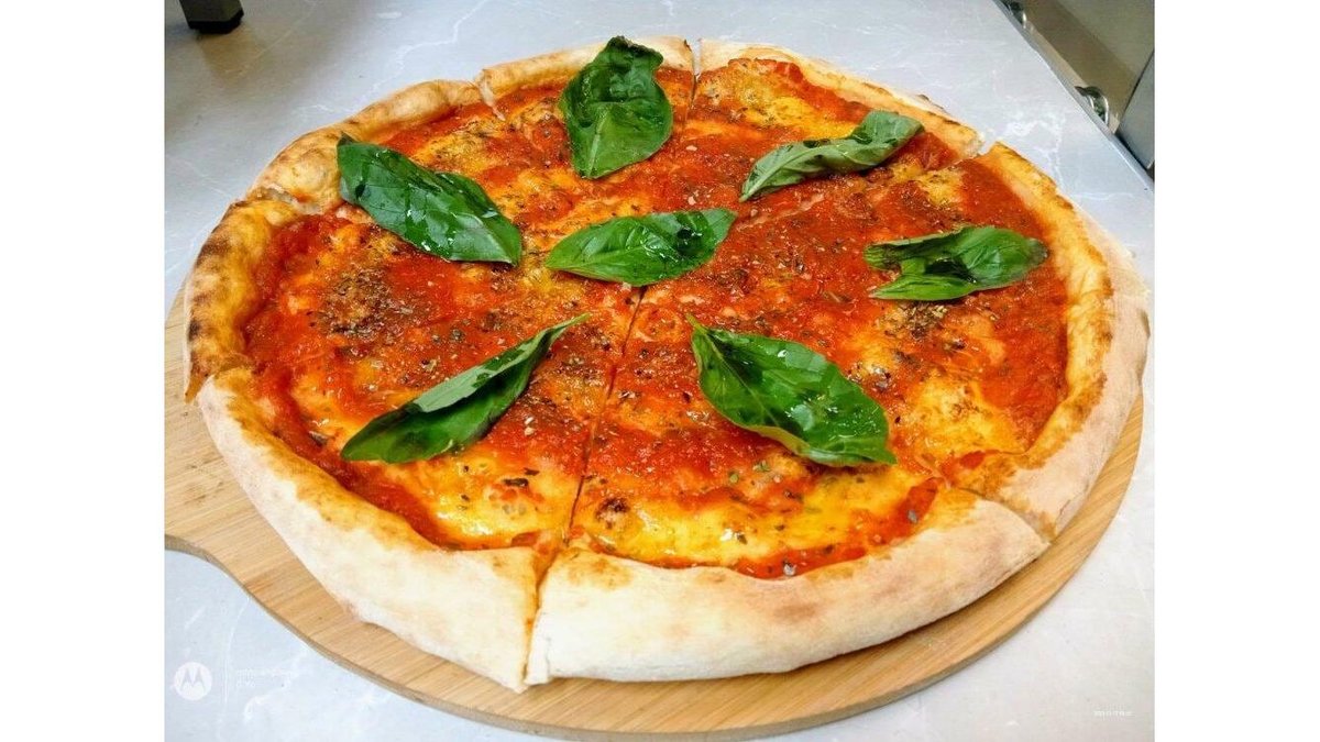 aluat de pizza copt in cuptorul cu lemne 600g, sos de rosii din pulpa de rosii Italia 80g mozzarella 200g si busuioc