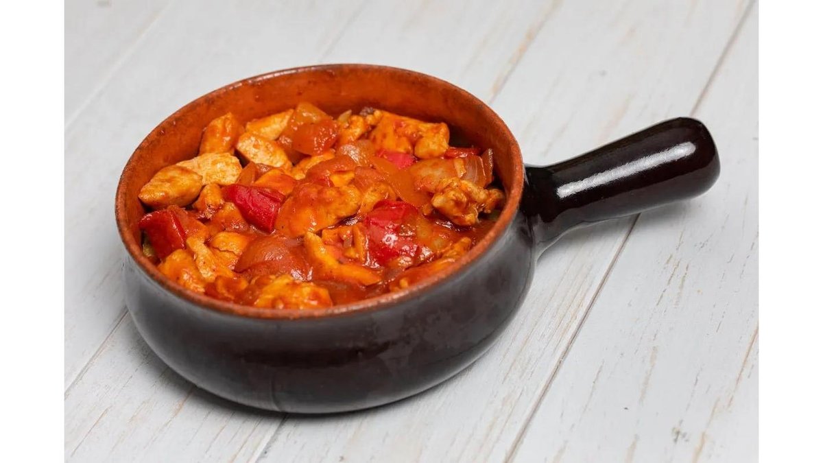 piept de pui, carnaciori semiafumati de porc, ciuperci, ardei gras,ardei iute ceapa, usturoi, sos rosii, si sos picant,toate trase la tigaie in condimente romanesti si vin