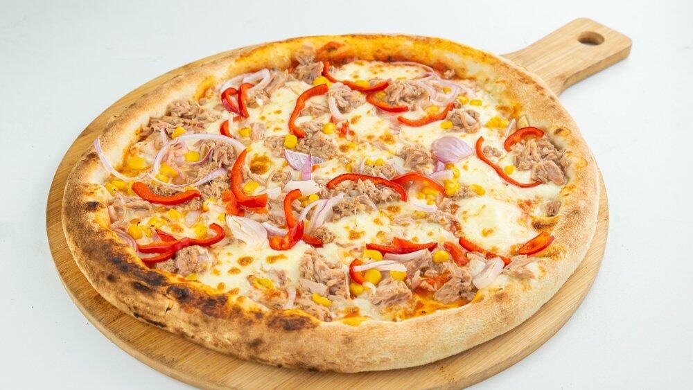 Sos de roșii, mozzarella, ceapă roșie, porumb și ton