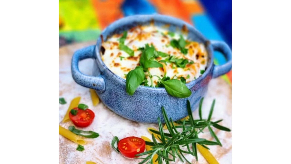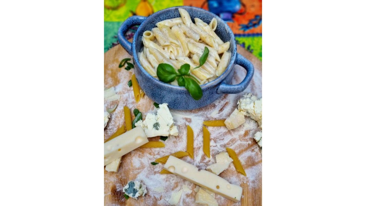 Paste proaspete de casă, sos de smântână dulce, gorgonzola, brie, ementhaler, parmezan și mozzarella fior di latte gratinate în cuptorul cu lemne