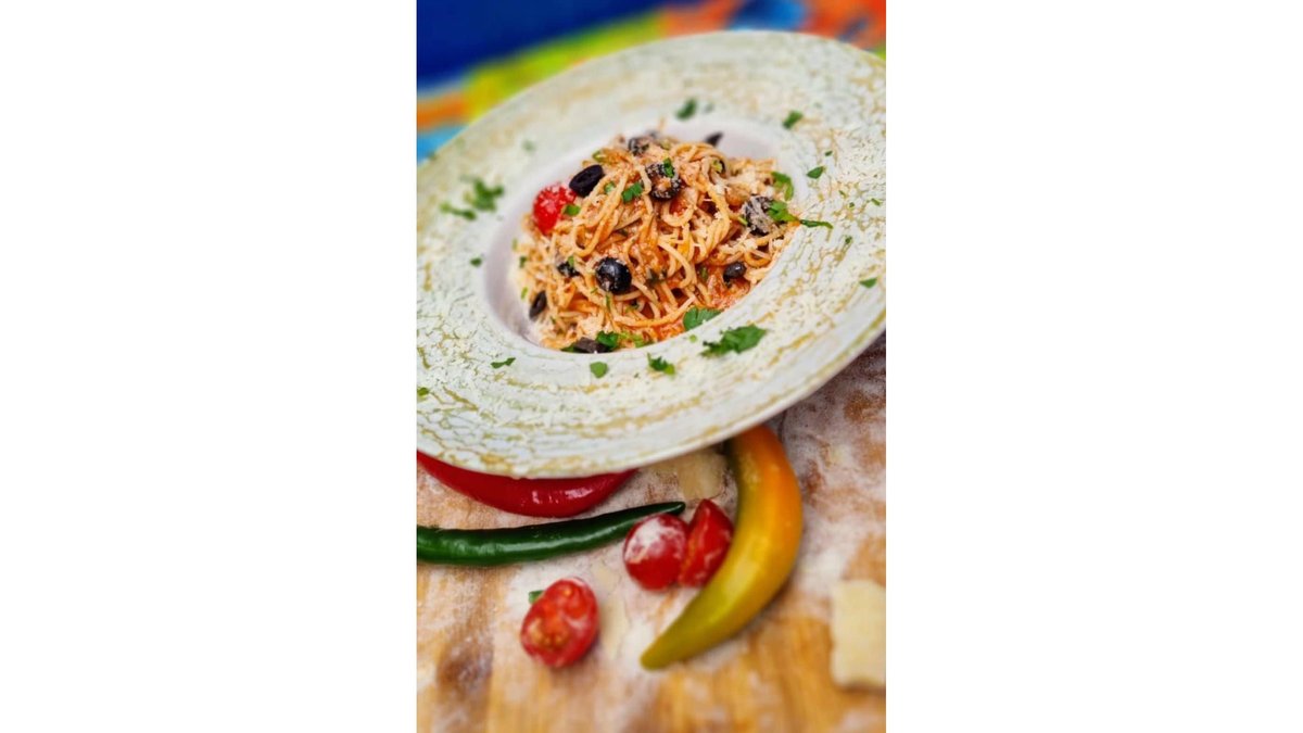 Paste integrale fără ou, sos de roșii, usturoi, ciuperci, ceapă verde, pătrunjel, ardei kapia, măsline