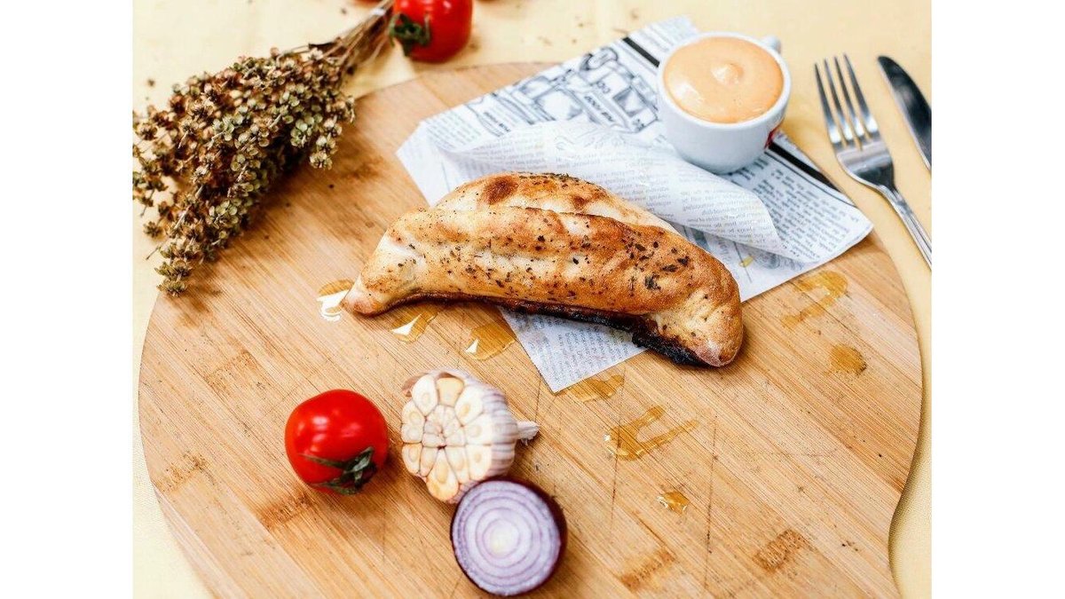 Piept de pui la gratar ,sos de roșii,ementaler,unt,usturoi și busuioc 120 g/30 g