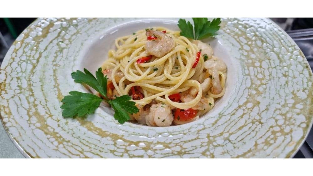 Paste proaspete de casă și creveți decorticați trași în unt, ulei de măsline extravirgin, usturoi, ardei iute, pătrunjel și roșii cherry stinși cu un strop de vodka
