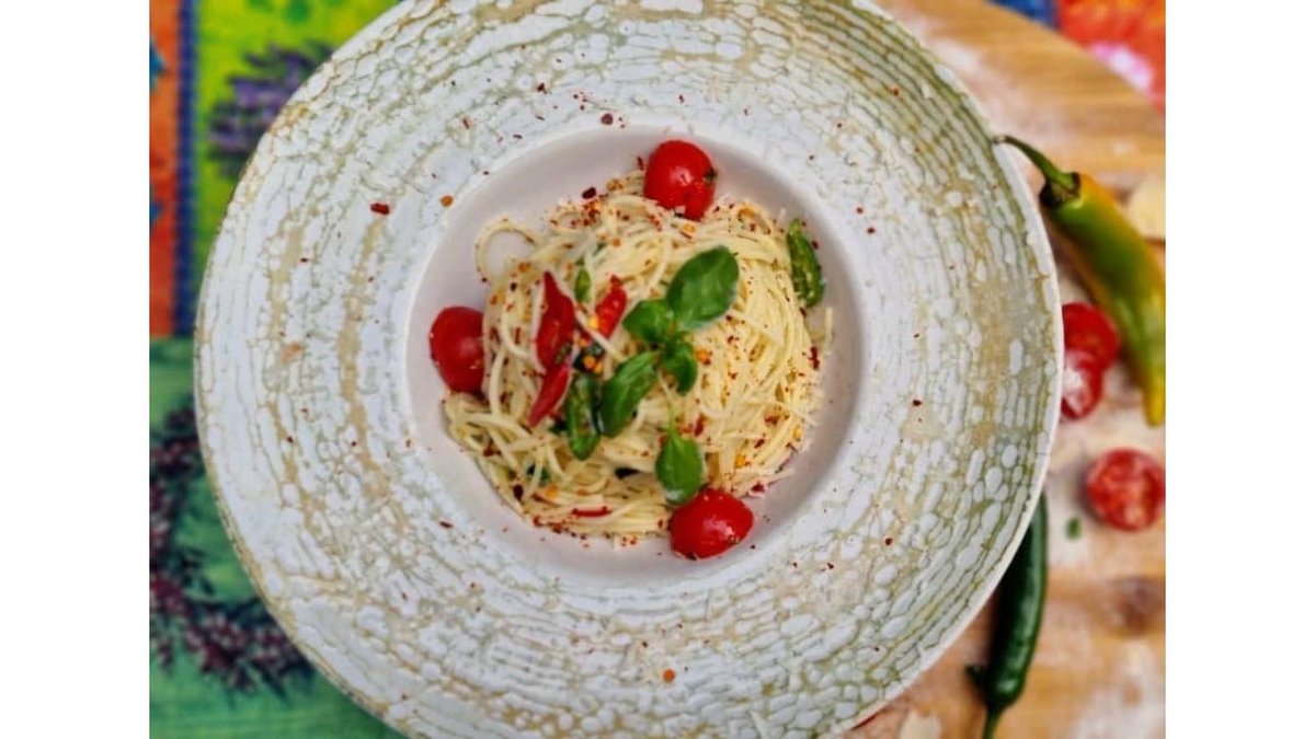 Paste proaspete de casă, ulei de măsline extravirgin, ardei iute, usturoi, pătrunjel și roșii cherry