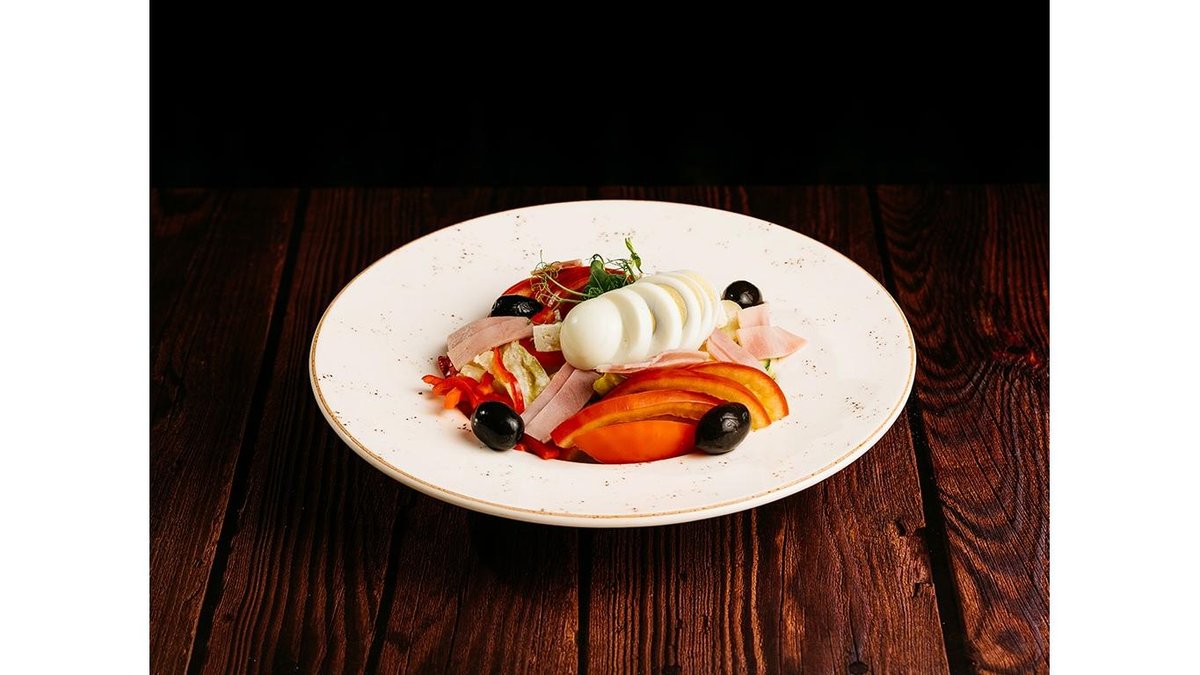 Sos rosii, mozzarella, topping pizza, sunca, ciuperci, masline