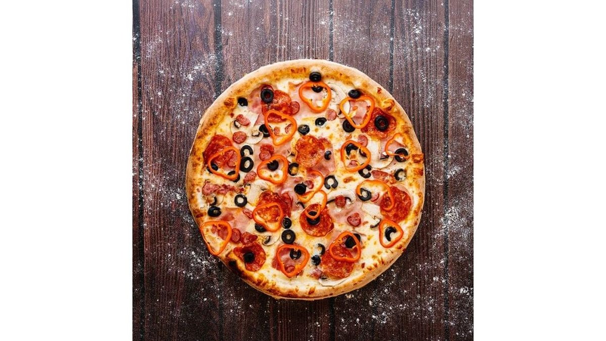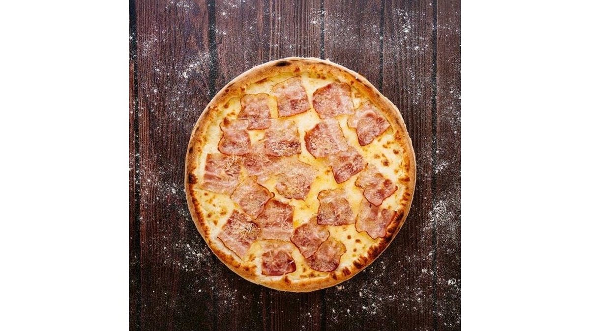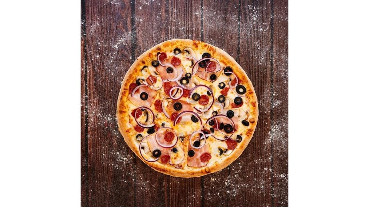Ingrediente: BLAT DE PIZZA (Faina, sare, ulei floarea soarelui, zahar), SOS DE PIZZA 30g(rosii,suc de rosii,corector de aciditate:acid citric) MOZZARELLA 70g(lapte, sare, cheag microbian, corectori de aciditate, acid citric, acid lactic, culturi lactice) SUNCA 20g(carne de porc ,apa,agent de ingrosare: caragenan,stabilizatori : trifosfati si polifosfati, dextroza, proteina de porc ,arome, potentiator de aroma : monoglutamat de sodiu, antioxidanti : acid ascorbic si bicarbonat de sodiu, aroma de fum, corector de aciditate : citrat de sodiu, condimente , extracte de origine vegetala din soia, amidon modificat. BACON 20g( piept de prc fara os, pulpa de porc ,amidon ,apa, sare , zaharuri : dextroza, stabilizatori : di si tripolifosfat de sodiu, antioxidanti : citrat de sodiu , agent gelatinizant : caragenan, arome colorant: suc de ridichie, conservant : nitrit de sodiu si acetat de sodiu , SALAM CHORIZO 10g( carne de porc , slanina carne vita , sare , condimente, dextroza , extracte de condimente , antioxidant : eritorbat de sodiu , conservant : nitrit de sodiu , cultura starter. PIEPT DE PUI 40g(piept de pui 95%, apa, proteina vegetala din soia , stabilizatori : di si trifosfati de sodiu, amidon modificat , sare , sirop de glucoza , corector de aciditate : acetat de sodiu si carbonat de sodiu potentiator de aroma : monoglutamat de sodiu , ulei vegetal de floarea soarelui, agent de ingrosare : guma xantan condimente : boia de ardei dulce , boia de ardei iute , usturoi , oregano si piper alb . zahar , maltodextrina , transglutamiaza , aroma de fum . MASLINE FELIATE 15g(masline, apa , sare,gluconat feros , acid lactic . ARDEI GRAS 15g