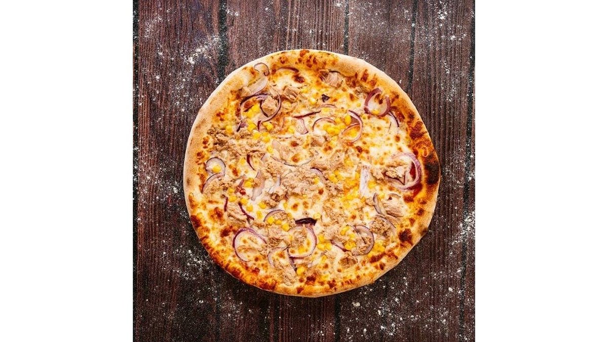 Sos rosii, mozzarella, topping pizza, ton, porumb, ceapa. Ingrediente: BLAT DE PIZZA (Faina, sare, ulei floarea soarelui, zahar), SOS DE PIZZA 50g (rosii,suc de rosii,corector de aciditate:acid citric) MOZZARELLA 140g (lapte, sare, cheag microbian, corectori de aciditate, acid citric, acid lactic, culturi lactice) CEAPA 30G, PORUMB 30G(porumb zaharat boabe , apa ,sare , zahar) TON 110G (ton , apa, sare , ulei de soia)