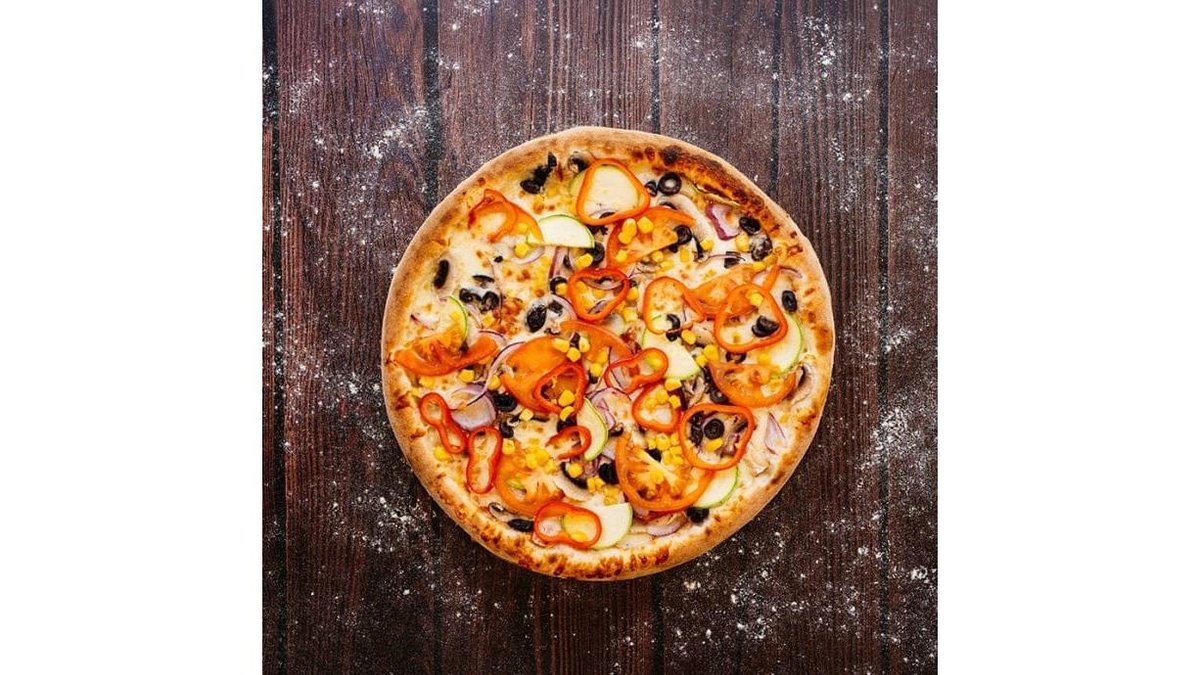 Sos rosii, mozzarella, topping pizza, ardei gras, dovlecei, rosii proaspete, ciuperci, porumb, ceapa, masline kalamata