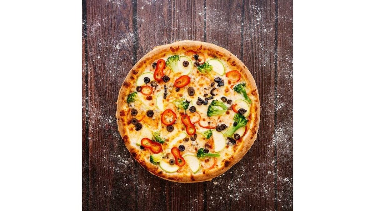 Sos rosii, mozzarella, topping pizza, broccoli, masline kalamata, dovlecei, ardei gras, usturoi