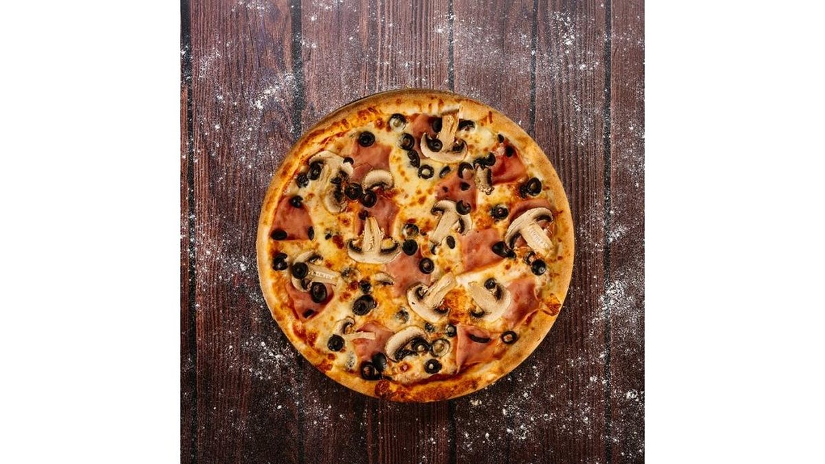 Sos rosii, mozzarella, topping pizza, sunca, masline, porumb. INGREDIENTE: BLAT DE PIZZA (Faina, sare, ulei floarea soarelui, zahar) SOS DE PIZZA 50g ( rosii, suc de rosii , corector de aciditate: acid citric) MOZZARELLA 140G (lapte, sare, cheag microbian, corectori de aciditate, acid citric, acid lactic, culturi lactice) CIUPERCI 60g. PORUMB 30G (porumb zaharat boabe , apa ,sare , zahar), SUNCA 40gr ( carne de porc, apa, agent de ingrosare: caragenan, stabilizatori: trifosfati si polifosfati , dextroza, proteina de porc , arome , potentiator de aroma: monoglutamat de sodiu, antioxidanti : acid ascorbic si bicarbonat de sodiu , aroma de fum, corector de aciditate: citrat de sodiu, condimente, extracte de origine vegetala din soia, amidon modificat, MASLINE FELIATE 30G ( masline, apa , sare, gluconat feros, acid lactic ).