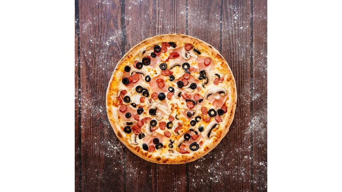Sos rosii, mozzarella, topping pizza, sunca, ciuperci, carnati, salam chorizo, ardei gras, masline. Ingrediente: BLAT DE PIZZA (Faina, sare, ulei floarea soarelui, zahar), SOS DE PIZZA 30g (rosii,suc de rosii,corector de aciditate: acid citric) MOZZARELLA 70g (lapte, sare, cheag microbian, corectori de aciditate, acid citric, acid lactic, culturi lactice) SUNCA 20g ( carne de porc, apa, agent de ingrosare: caragenan, stabilizatori: trifosfati si polifosfati , dextroza, proteina de porc , arome , potentiator de aroma: monoglutamat de sodiu, antioxidanti : acid ascorbic si bicarbonat de sodiu , aroma de fum, corector de aciditate: citrat de sodiu, condimente, extracte de origine vegetala din soia, amidon modificat. CIUPERCI 30g, CARNATI SEMIAFUMATI 20G ( carne de porc, carne de vita, apa, proteina vegetala din soia, dextroza proteina de porc , sorici, sare, emulsifiant : mono si digliceride ale acizilor grasi, agenti de ingrosare: caragenan, guma de cantan ) proteina de mazare.stabilizatori : difosfati si polifosfsti, antioxidanti : acid ascorbic bicarbonat de sodiu , corector de aciditate : citrati de sodiu , glucono detta lactona ,lactoza , condimente : contin boabe de mustar, arome, potentiator de gust : monoglutamat de sodiu , aroma de fum , conservanti: lactat de sodiu , acetati de sodiu , nitrit de sodiu , colorant : carmina , membrana naturala comestibila: mate de oaie . SALAM CHORIZO 10G ( carne de porc , slanina , carne vita, sare condimente , dextroza , extracte de condimente , antioxidant :eritorbat de sodiu , conservant : nitrit de sodiu , cultura starter . MASLINE FELIATE 15G ( masline, apa , sare , gluconat feros, acid lactic ) ARDEI GRAS 15G