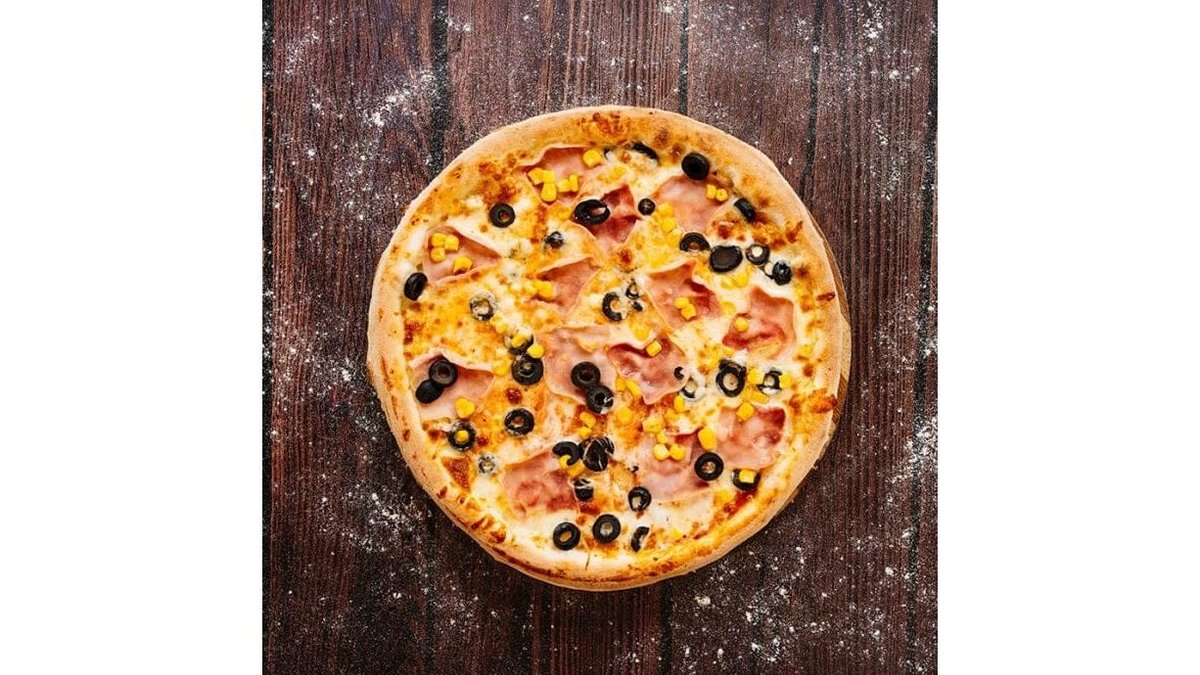 Sos rosii, mozzarella, topping pizza, sunca, masline, porumb. INGREDIENTE: BLAT DE PIZZA (Faina, sare, ulei floarea soarelui, zahar) SOS DE PIZZA 30gr ( rosii, suc de rosii , corector de aciditate: acid citric) MOZZARELLA 70gr (lapte, sare, cheag microbian, corectori de aciditate, acid citric, acid lactic, culturi lactice) CIUPERCI 30gr. PORUMB 10gr (porumb zaharat boabe , apa ,sare , zahar), SUNCA 20gr ( carne de porc, apa, agent de ingrosare: caragenan, stabilizatori: trifosfati si polifosfati , dextroza, proteina de porc , arome , potentiator de aroma: monoglutamat de sodiu, antioxidanti : acid ascorbic si bicarbonat de sodiu , aroma de fum, corector de aciditate: citrat de sodiu, condimente, extracte de origine vegetala din soia, amidon modificat, MASLINE FELIATE 15gr ( masline, apa , sare, gluconat feros, acid lactic ).
