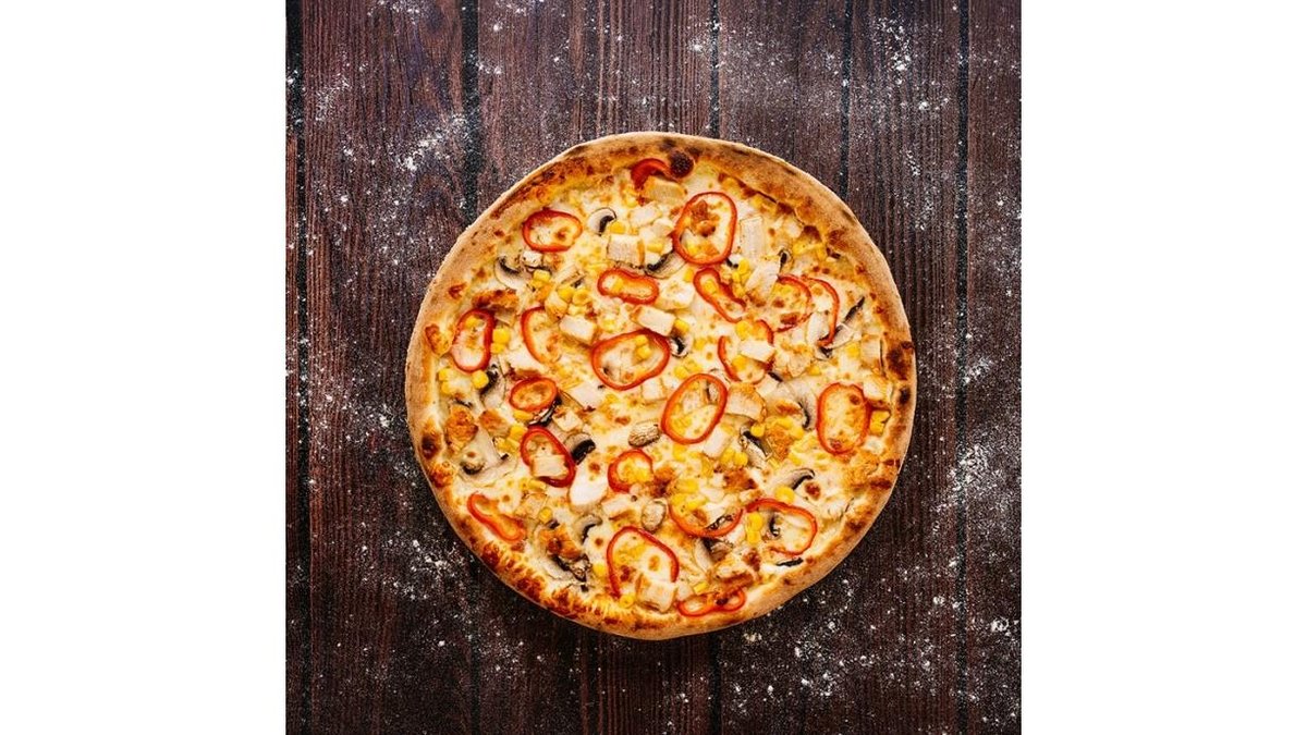 Sos rosii, mozzarella, topping pizza, piept de pui, ciuperci, ardei gras, porumb. INGREDIENTE : BLAT DE PIZZA (Faina, sare, ulei floarea soarelui, zahar), SOS DE PIZZA 30g( rosii, suc de rosii , corector de aciditate :acid citric) MOZZARELLA 70g(lapte, sare, cheag microbian, corectori de aciditate, acid citric, acid lactic, culturi lactice) CIUPERCI 30g. ARDEI GRAS 15g, PIEPT DE PUI 40g(piept de pui 95%, apa, proteina vegetala din soia , stabilizatori : di si trifosfati de sodiu, amidon modificat , sare , sirop de glucoza, corector de aciditate : acetat de sodiu si carbonat de sodiu , potentiator de aroma : monoglutamat de sodiu , ulei vegetal de floarea soarelui, agent de ingrosare : guma xantan , condimente : boia de ardei dulce , boia de ardei iute , usturoi , oregano si piper alb . zahar , maltodextrina , transglutamiaza , aroma de fum . PORUMB 10g(porumb zaharat boabe, apa, sare, zahar)