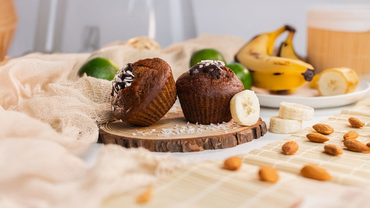 banane, faina alba de grau, faina integrala de grau, ulei de floarea soarelui, zahar cocos, cacao, masa cacao, bicarbonat sodiu, suc lamaie, migdale, nucsoara, scortisoara, portocala, stafide, cacao, masa cacao 2 bucati