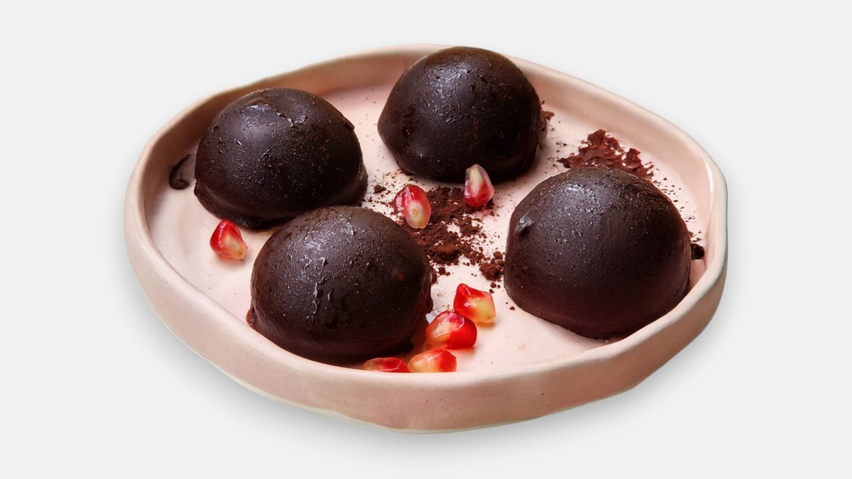 acadea din blat din faina de midgale , banane , cacao, zahar de cocos, invetita in ciocolata si tavalita prin migdale