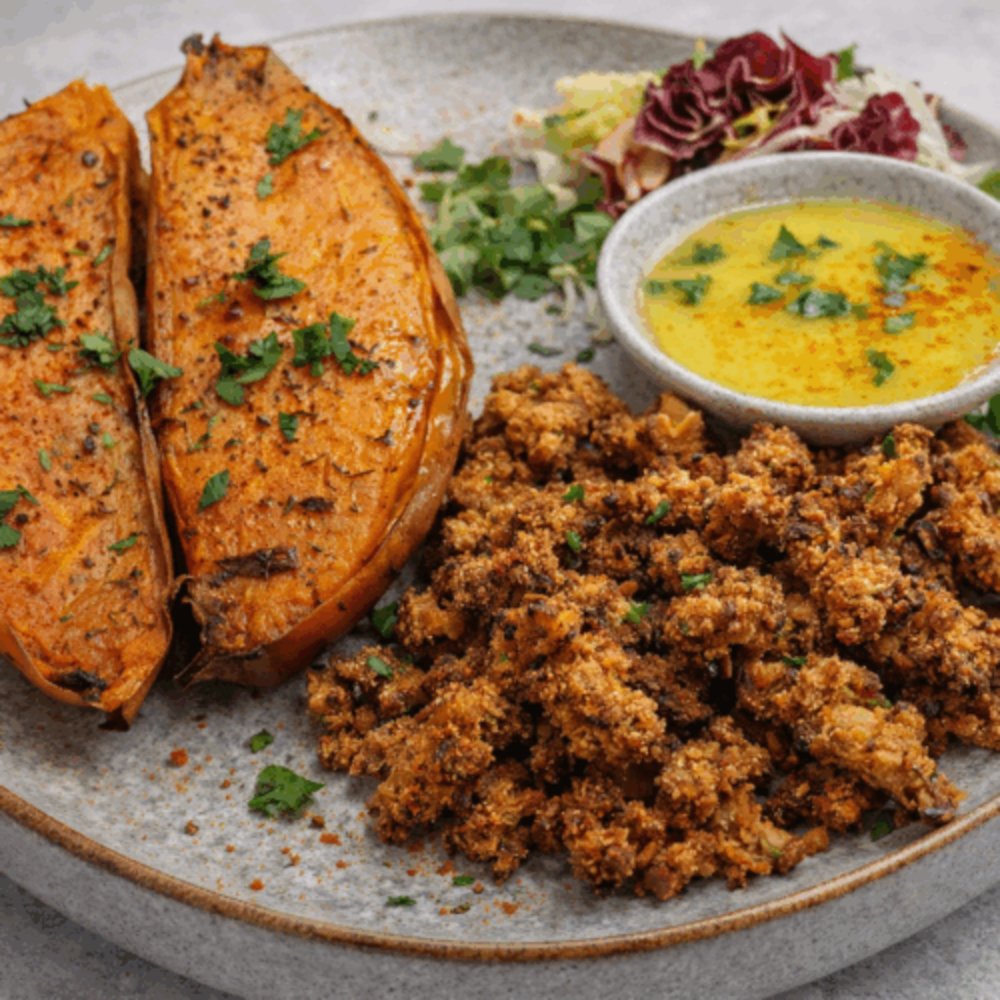 Dovlecei fragezi, amestecați cu verdețuri proaspete și condimente alese, copți ușor până devin aurii și parfumati. Alături, un tzatziki fin și răcoritor, făcut în casă din iaurt cremos de caju, castraveți și usturoi. O farfurie care îmbină prospețimea cu gustul bogat — reconfortantă, ușoară și pur și simplu irezistibilă. Ingrediente - dovlecei, tofu, morcovi, telina, fulgi ovaz, ceapa, sos rosii, ulei masline, fulgi drojdie inactiva, usturoi, psyllium, sare, patrunjel, marar, piper, boia dulce, caju, castraveti, suc lamaie, fulgi ovaz, susan, in, chia, seminte floarea soarelui, seminte dovleac