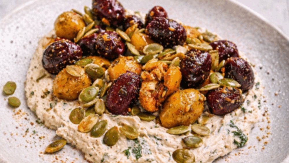 branza de caju (caju, marar, ceapa verde, lamaie, sare), masline kalamata, masline verzi, zatar, miez de seminte de dovleac, ulei de masline