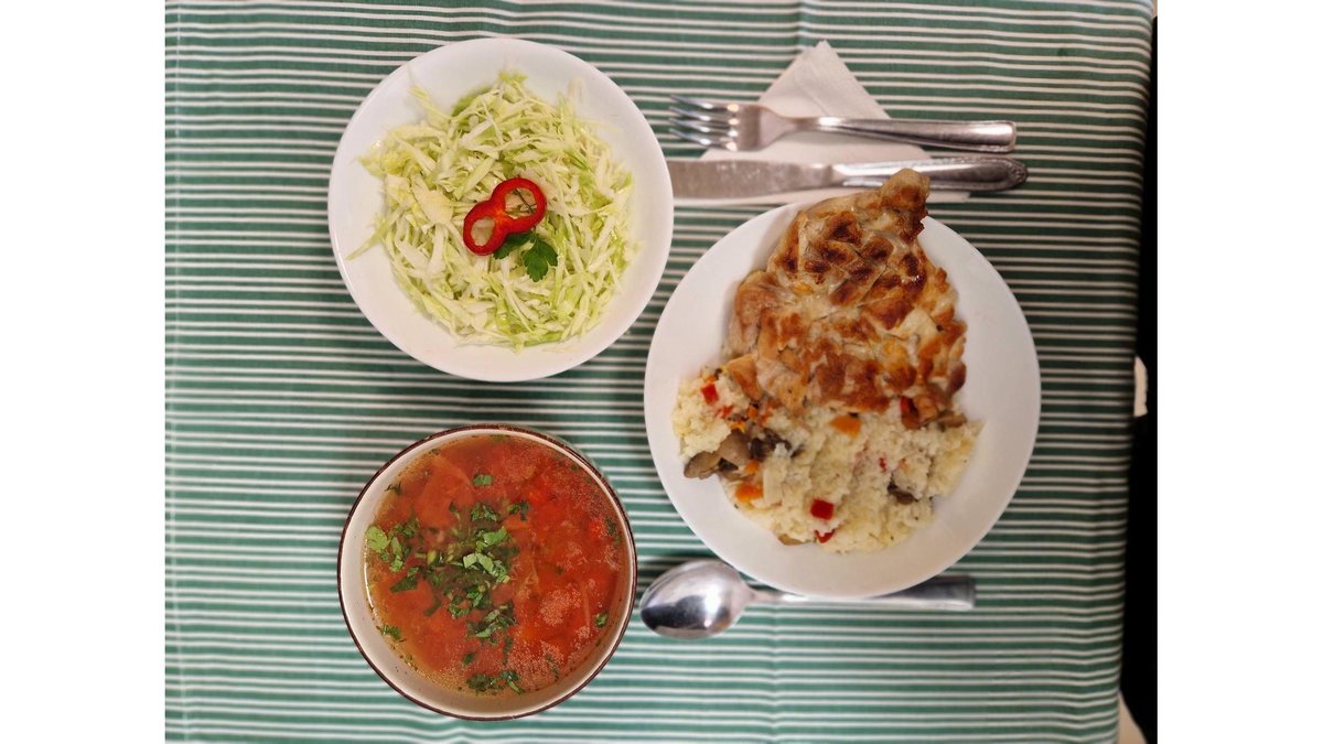 Ciorbă de legume, șnițel de pui, orez cu legume, salată de varză albă