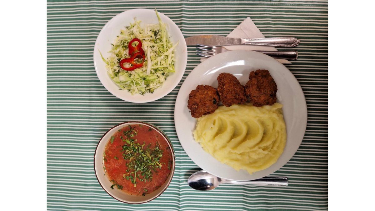 Ciorbă de legume, chifteluțe de porc, piure de cartofi, salată de varză albă