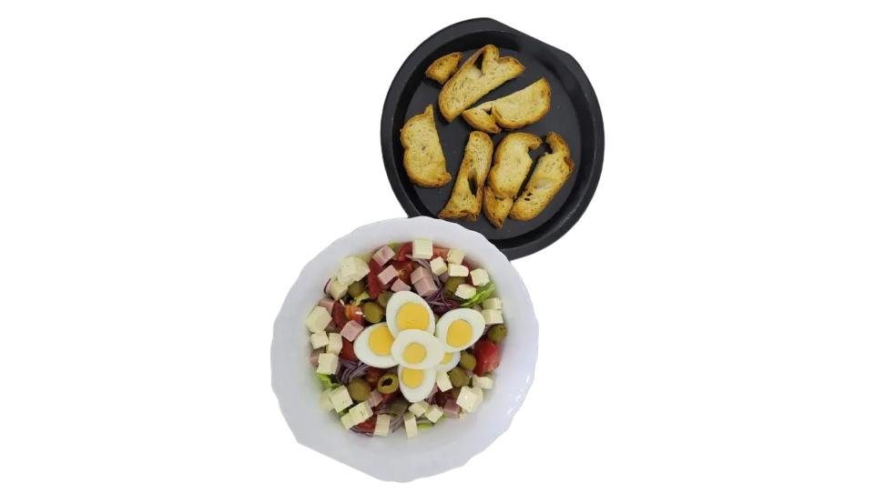 Salată verde, roșii, castraveți, măsline, ardei, brânză, șuncă, ou, ceapă 550 g