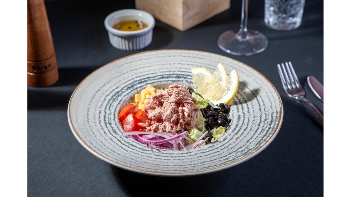 Mix de salată, ton, roșii, porumb, măsline, ceapă roșie, dressing