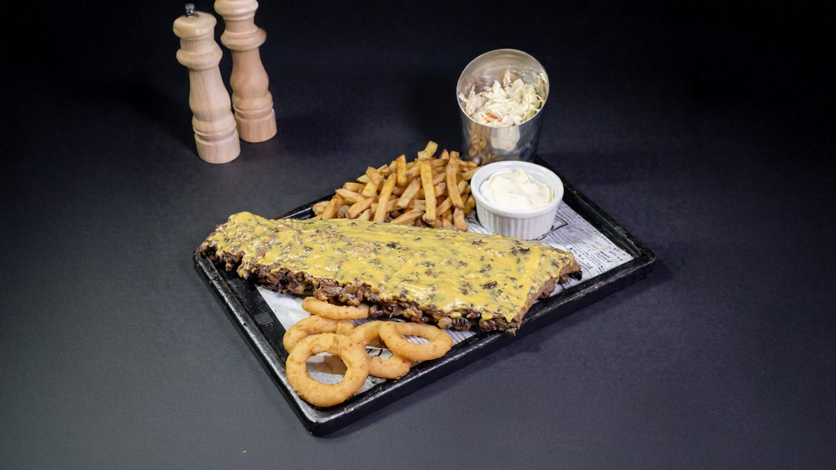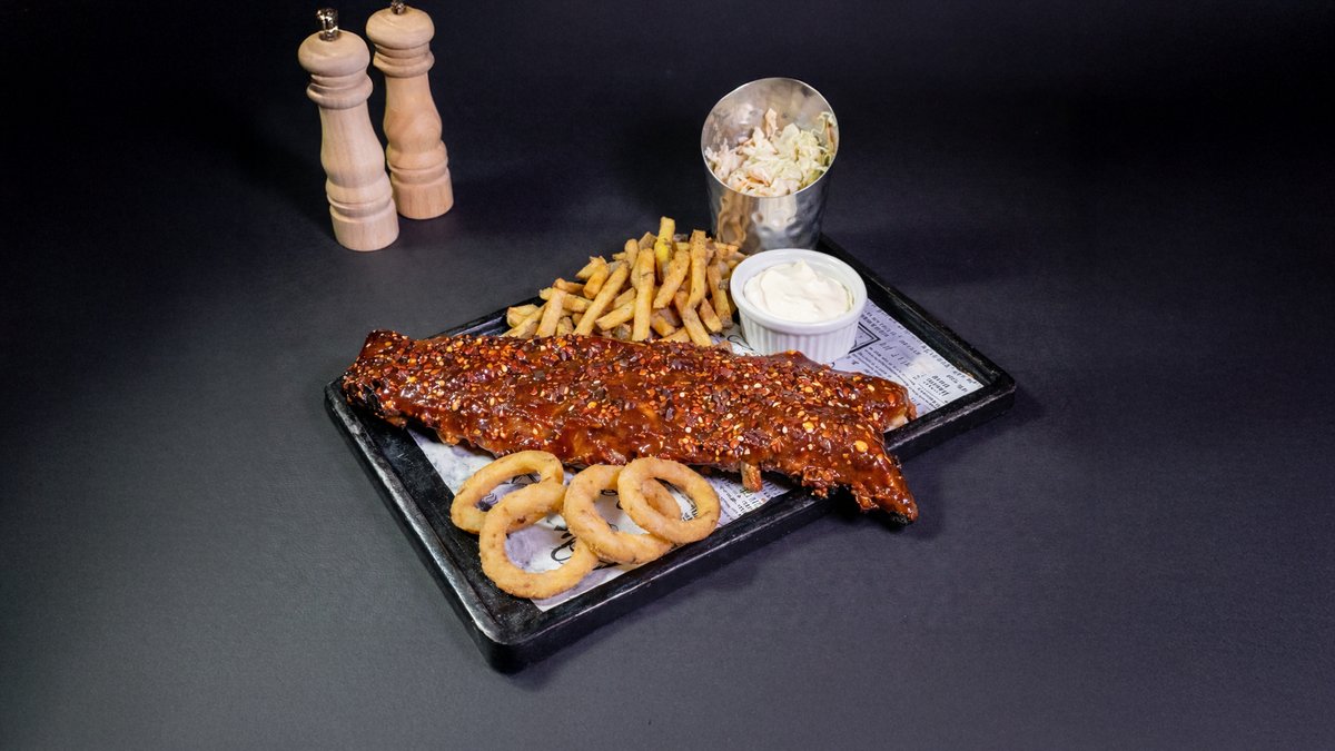 Amatorii de senzații tari au aici o porție de coaste unde la marinat vedeta a fost ardeiul iute. Vin și ele cu salată coleslaw, cartofi prăjiți și onion rings 900 gr