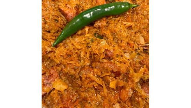 Varză, ceapă, sos de roșii, cârnat afumat, ulei, condimente. 250g