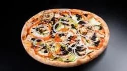 Mozzarella vegetală, porumb, ardei gras, vinete, măsline, ceapă, dovlecel, ciuperci, sos de roșii cu oregano