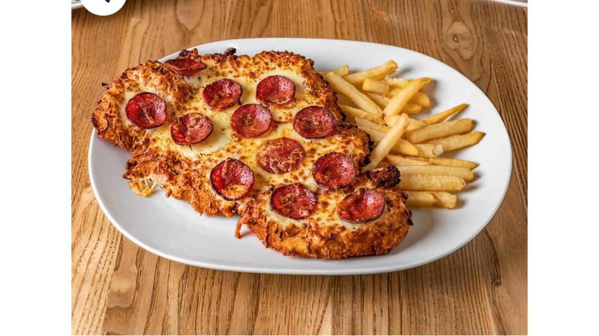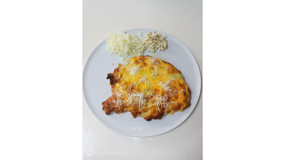 Piept de pui,sos de roșii , mozzarella,șuncă de praga, oua ochiuri .