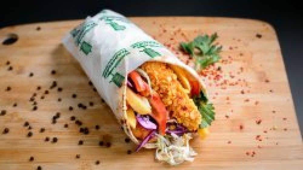 Tortilla, șnițel de pui în crustă de semințe, explozie de brânză, ceapă crispy, castravete murat, roșie, bacon, mozzarella