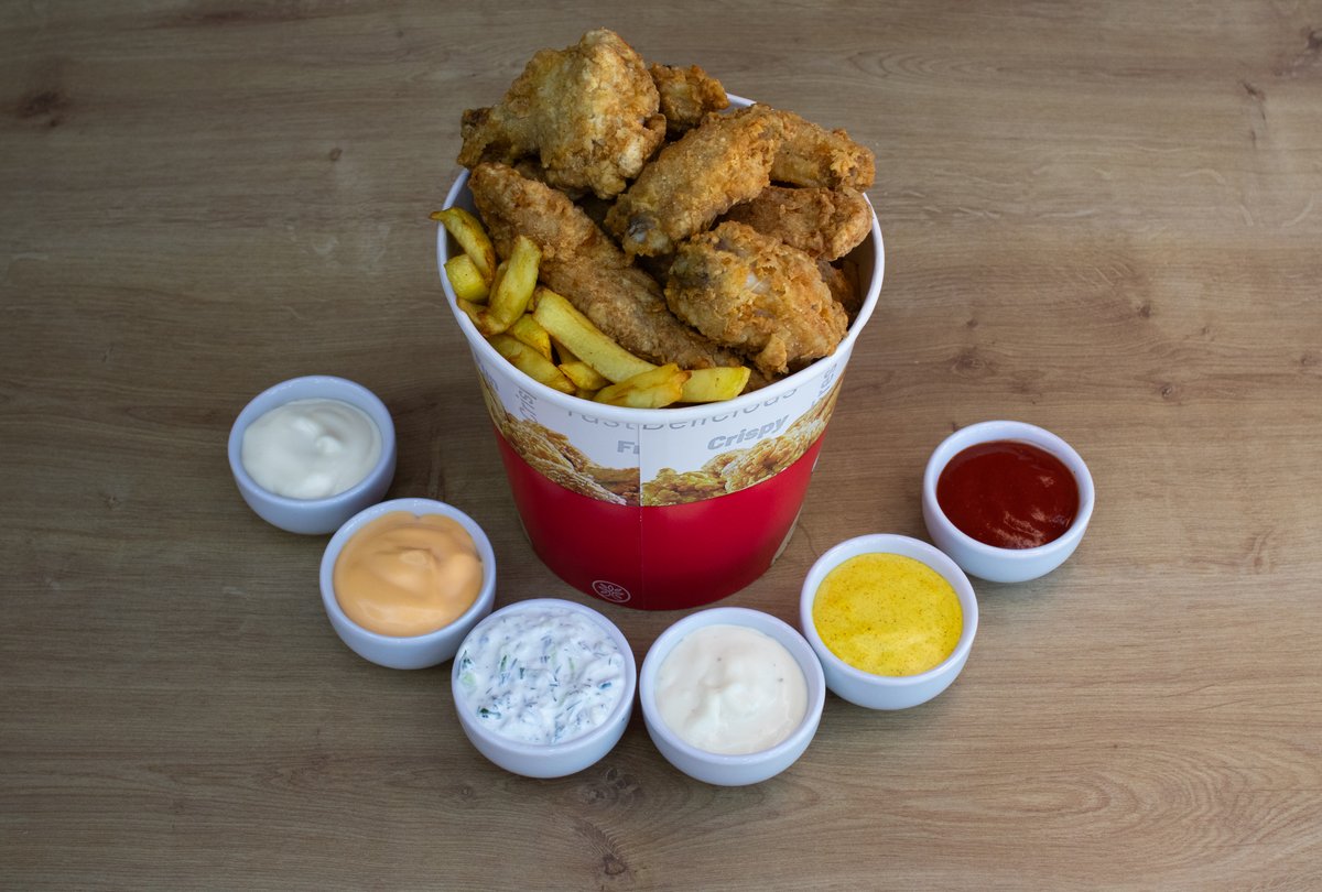 Aripioare 700 g, cartofi prăjiți 300 g, sos de usturoi 25 g, maioneză picantă 25 g 1000 g