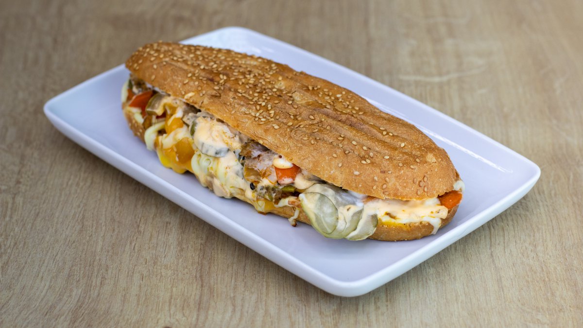Baghetă 110 g, carne de pui 100 g, legume coapte 100 g, maioneză picantă 20 g, sos de usturoi 20 g, castraveți murați 20 g, cheese 100 g 470 g