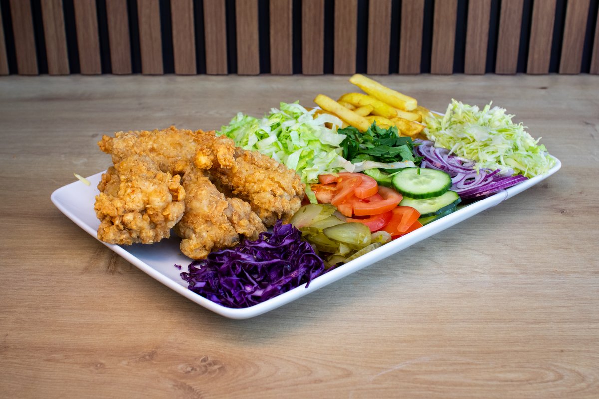 Carne de pui 200 g, cartofi 150 g, varză 80 g, castraveți 60 g, ceapă 20 g, pătrunjel 20 g, roșii 50 g, ardei iute 10 g, sos de usturoi 30 g, ketchup 25 g, maioneză picantă 25 g, maioneză 25 g, curry 25 g, tzatziki 25 g 750 g