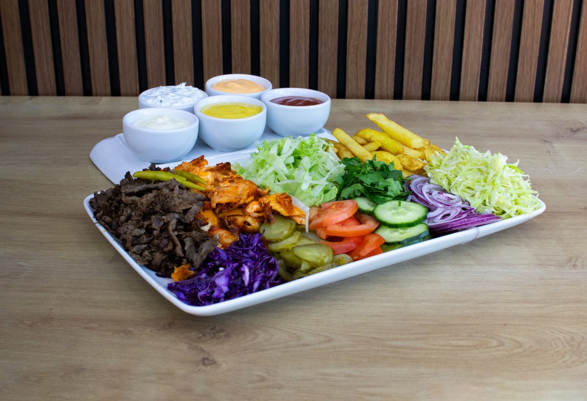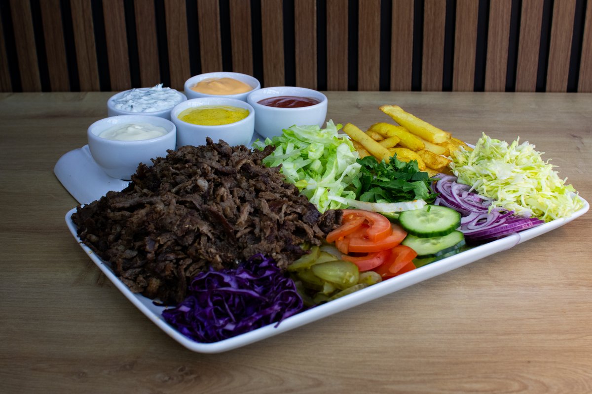 Carne de vită-berbecut 230 g, cartofi 150 g, varză 80 g, castraveți 60 g, ceapă 20 g, pătrunjel 20 g, roșii 50 g, ardei iute 10 g, sos de usturoi 30 g, ketchup 25 g, maioneză picantă 25 g, maioneză 25 g, curry 25 g, tzatziki 25 g 750 g