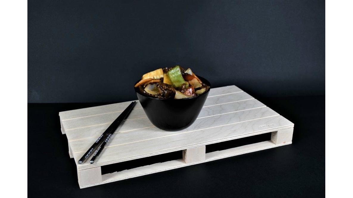 Cocktail fructe de mare, urechi de lemn, ardei gras 3 culori, bambus, ulei, sare, piper, condimente chinezesti, ulei de susan 300 g