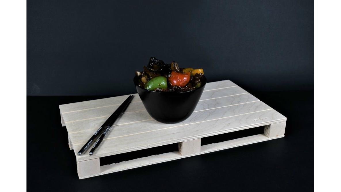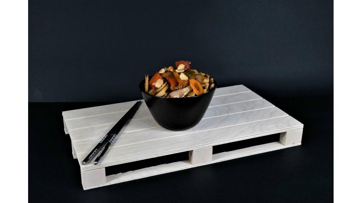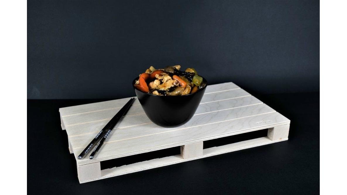 Piept de pui, legume chinezesti, ceapa, ardei gras, morcovi, usturoi, alune, pasta iute, sare, condimente chinezesti 300 g