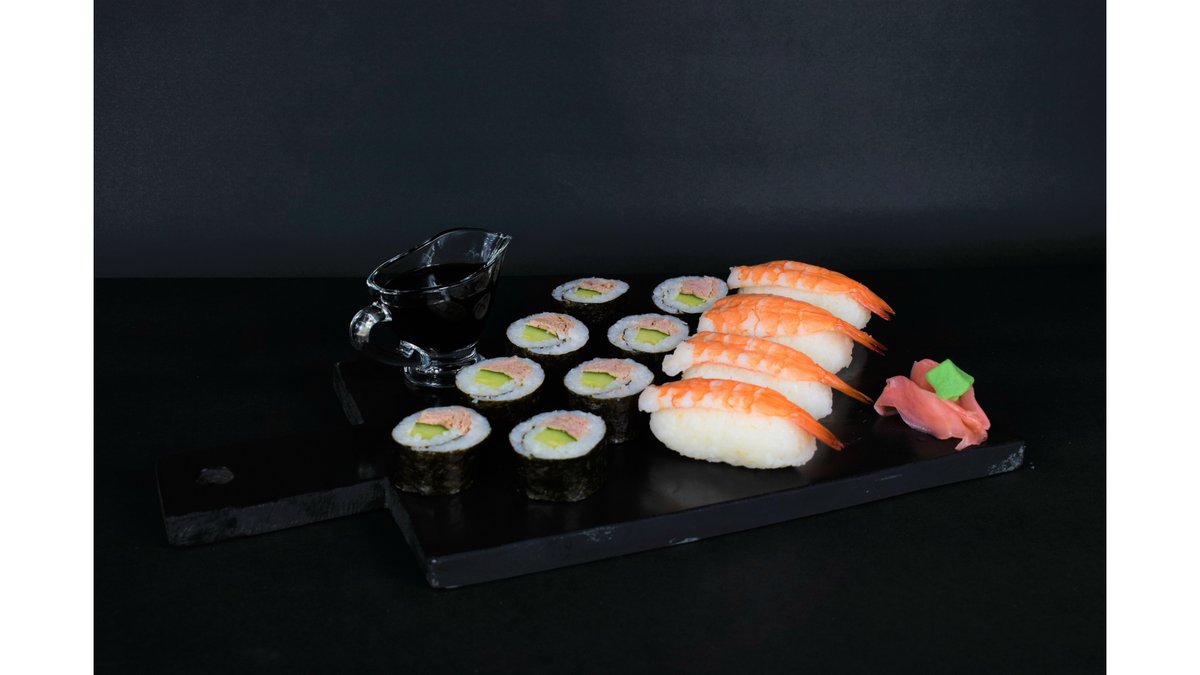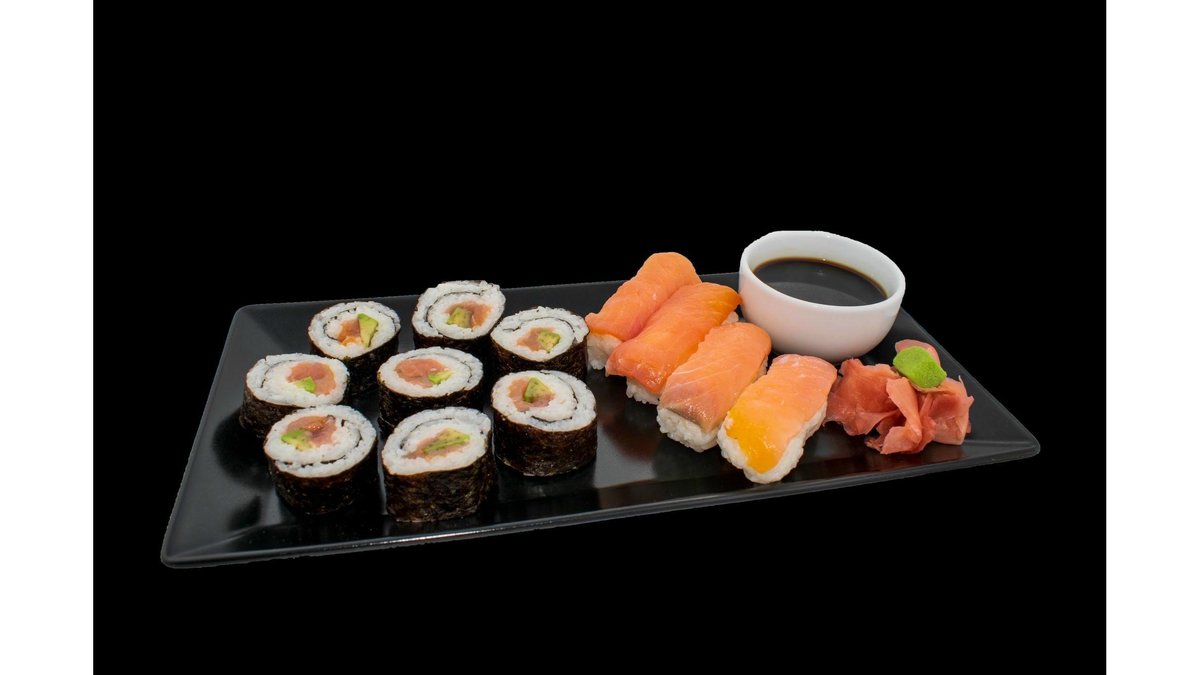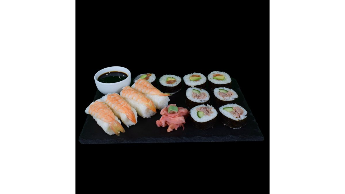 (4 maki somon, 4 maki ton, 4 nigiri creveti eby) orez, somon fume, ton, avocado, castravete, sos soia, ghimbir murat, wasabi