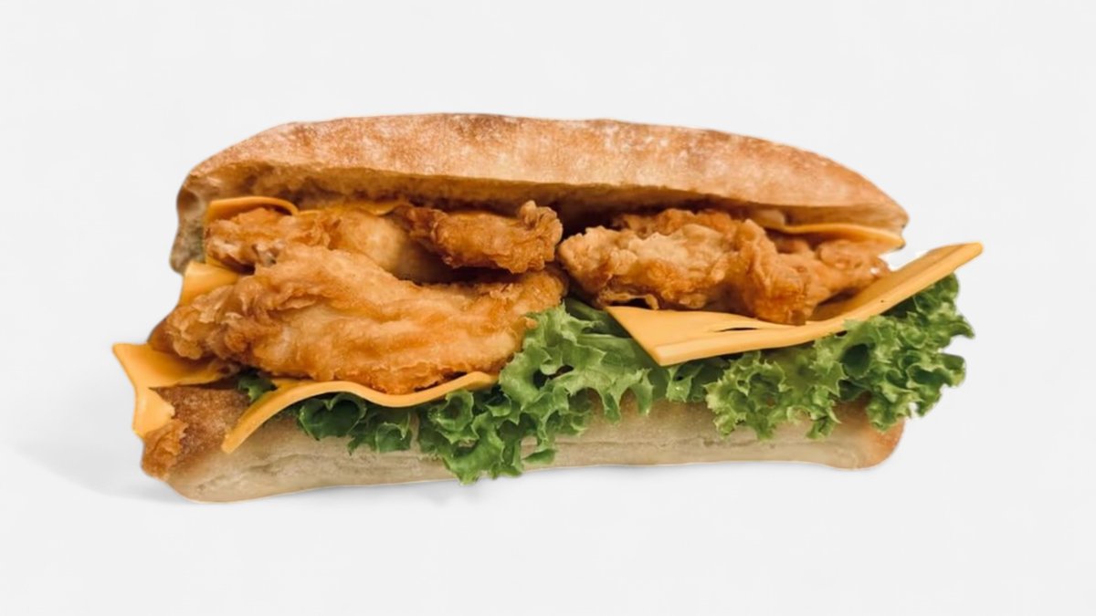 Bagheta, pui kentucky (2 buc), salata lollo, ceapa crispy, 2 felii cheddar, dressing