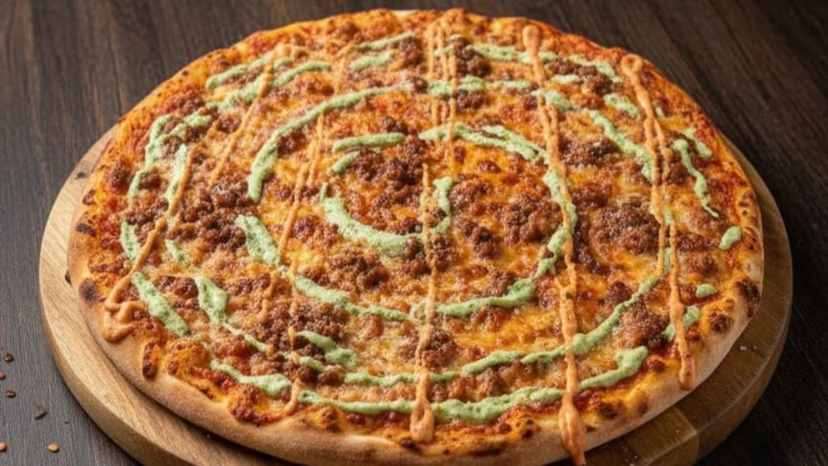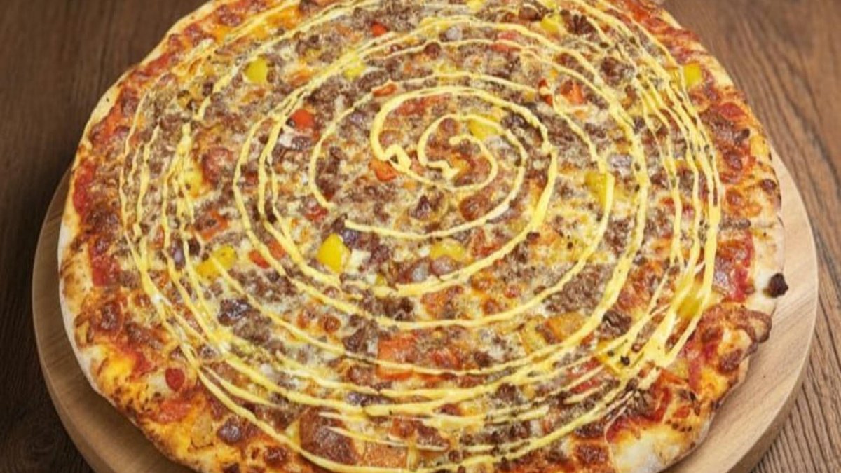 Blat, sos de pizza, mozzarella, carne tocată de vită, ardei și ceapă roșie, sos cheddar - 1.8kg