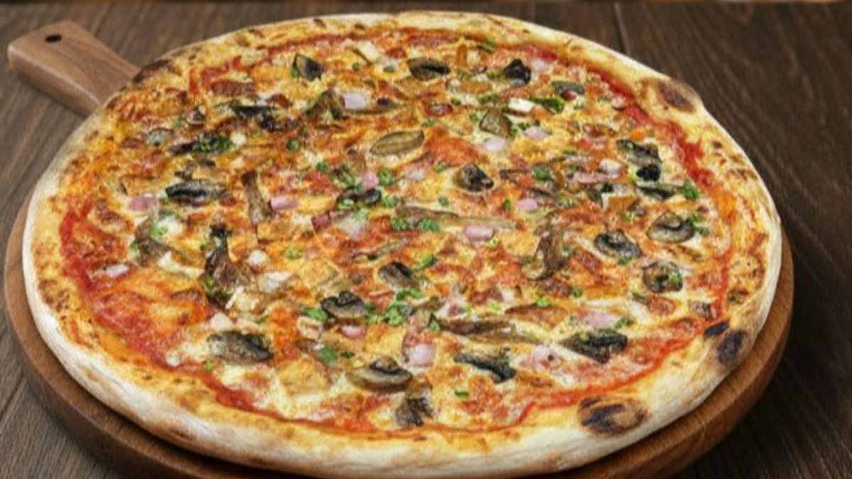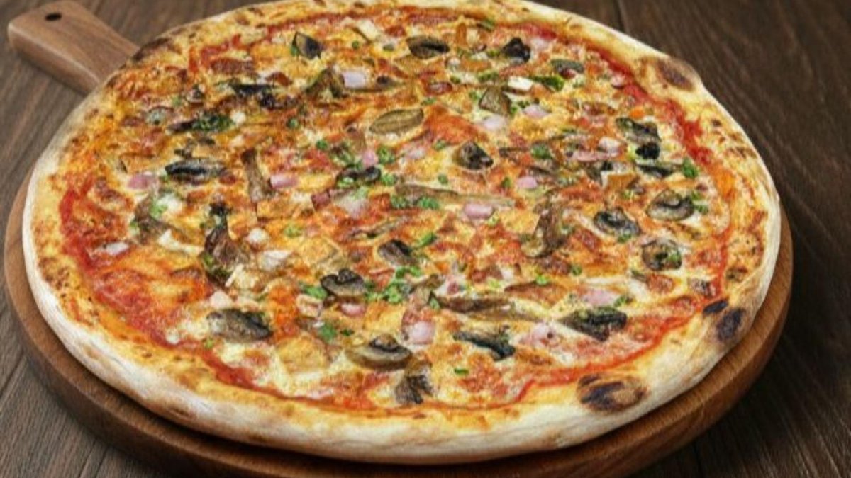 Blat, sos de pizza, mozzarella, ciuperci sote cu ceapa, bacon crocant - 1030g